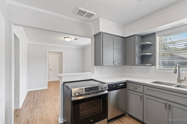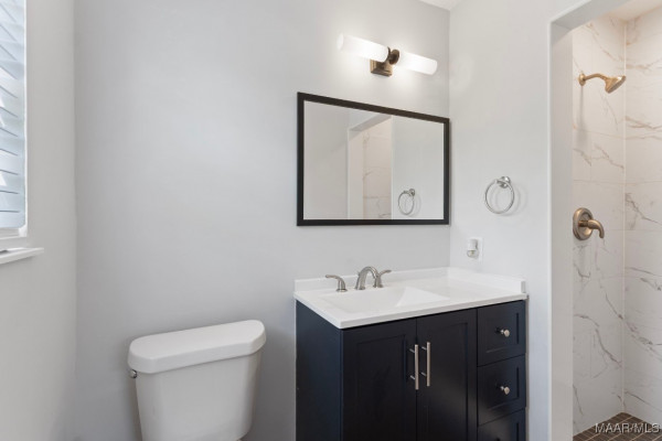 The kitchen shines with quartz countertops, a functional breakfast bar overlooking the dining room, new stainless-steel appliances, and refinished cabinets with modern doors.