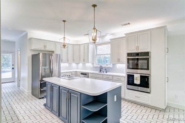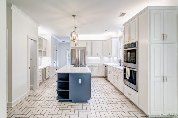 The recently updated kitchen features double ovens, a glass Jenn air cooktop, a butler’s pantry, a regular pantry, and a breakfast nook with pond views.