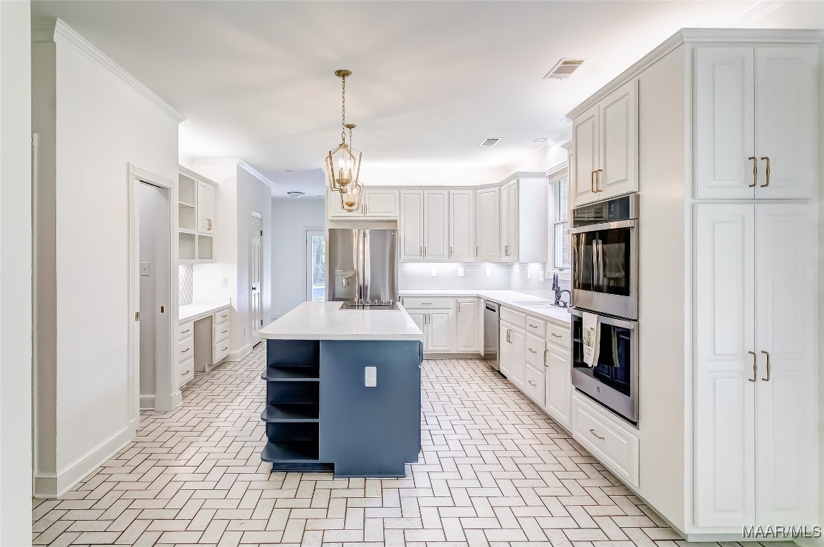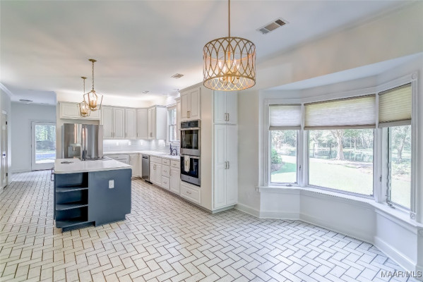 The recently updated kitchen features double ovens, a glass Jenn air cooktop, a butler’s pantry, a regular pantry, and a breakfast nook with pond views.