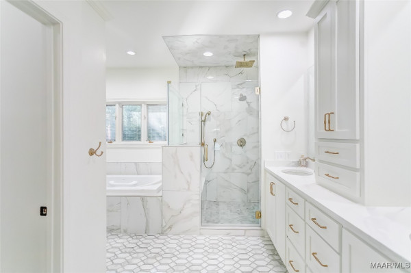The downstairs features a spacious beautiful kitchen, a large airy sunroom, a cozy den, a formal dining room, a study, a guest room with ensuite bath, a laundry room, and a master suite with a renovated bathroom and closet system. The master bath has a multi head shower and an air jetted tub. The downstairs features new hardwood flooring through the common areas and new carpet in the bedrooms.