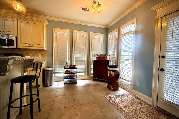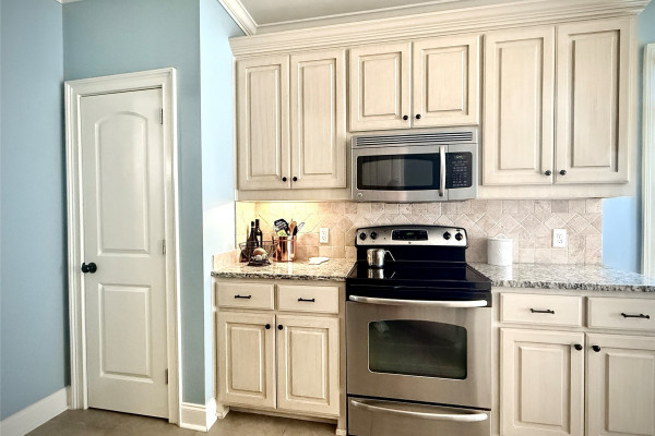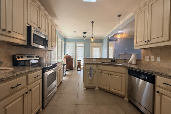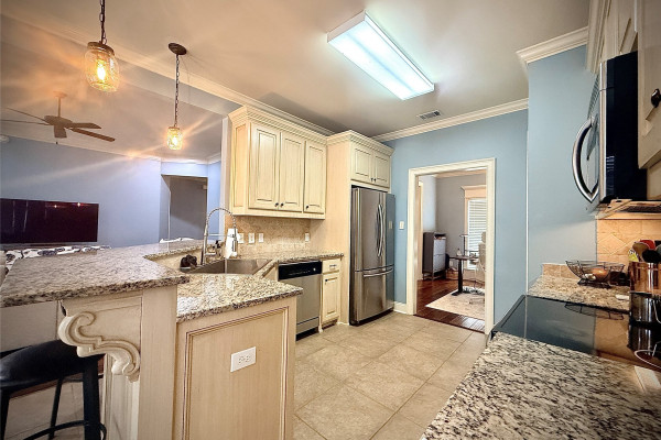 The kitchen is a standout feature with granite countertops, stainless steel appliances including the refrigerator, and plenty of cabinet space—perfect for cooking, hosting, or everyday convenience.