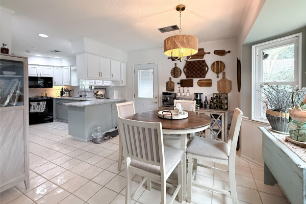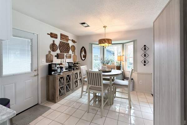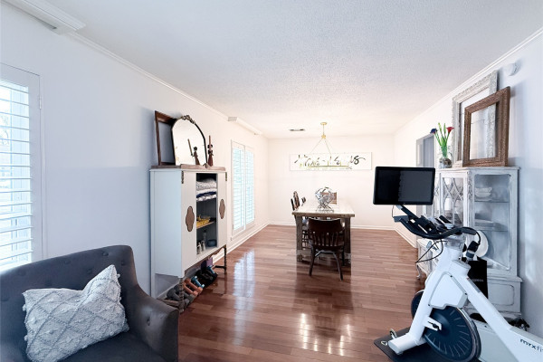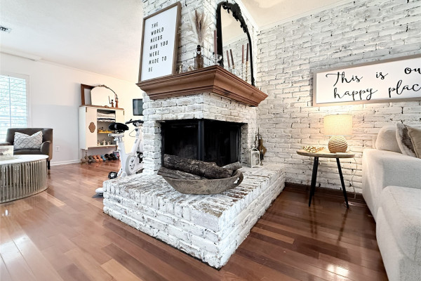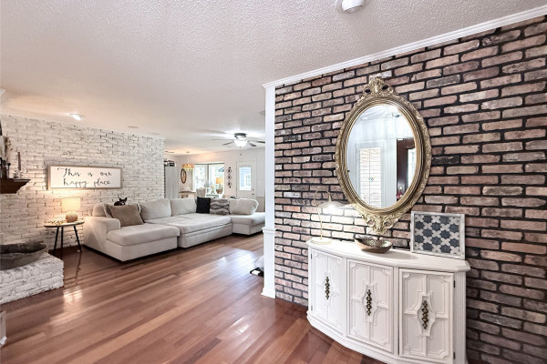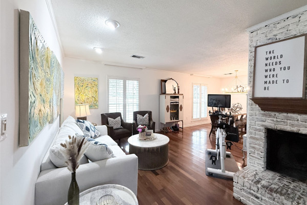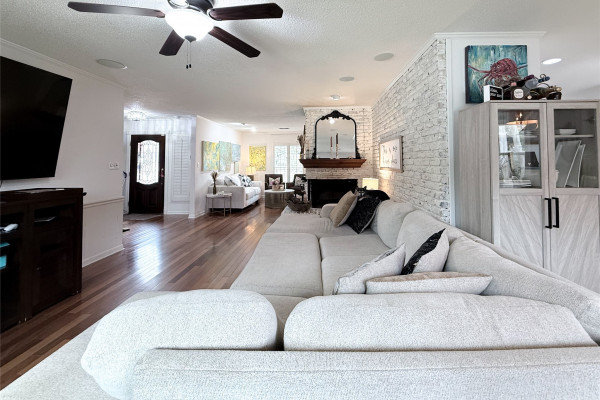 The spacious living room is the heart of the home, featuring a stunning wraparound brick fireplace, surround sound, and an extra-large window that fills the space with natural light and offers peaceful views of the backyard and pool. Just off the living area, the formal dining room flows seamlessly into an additional sitting area, perfect for a home office, reading nook, or flex space to fit your lifestyle.