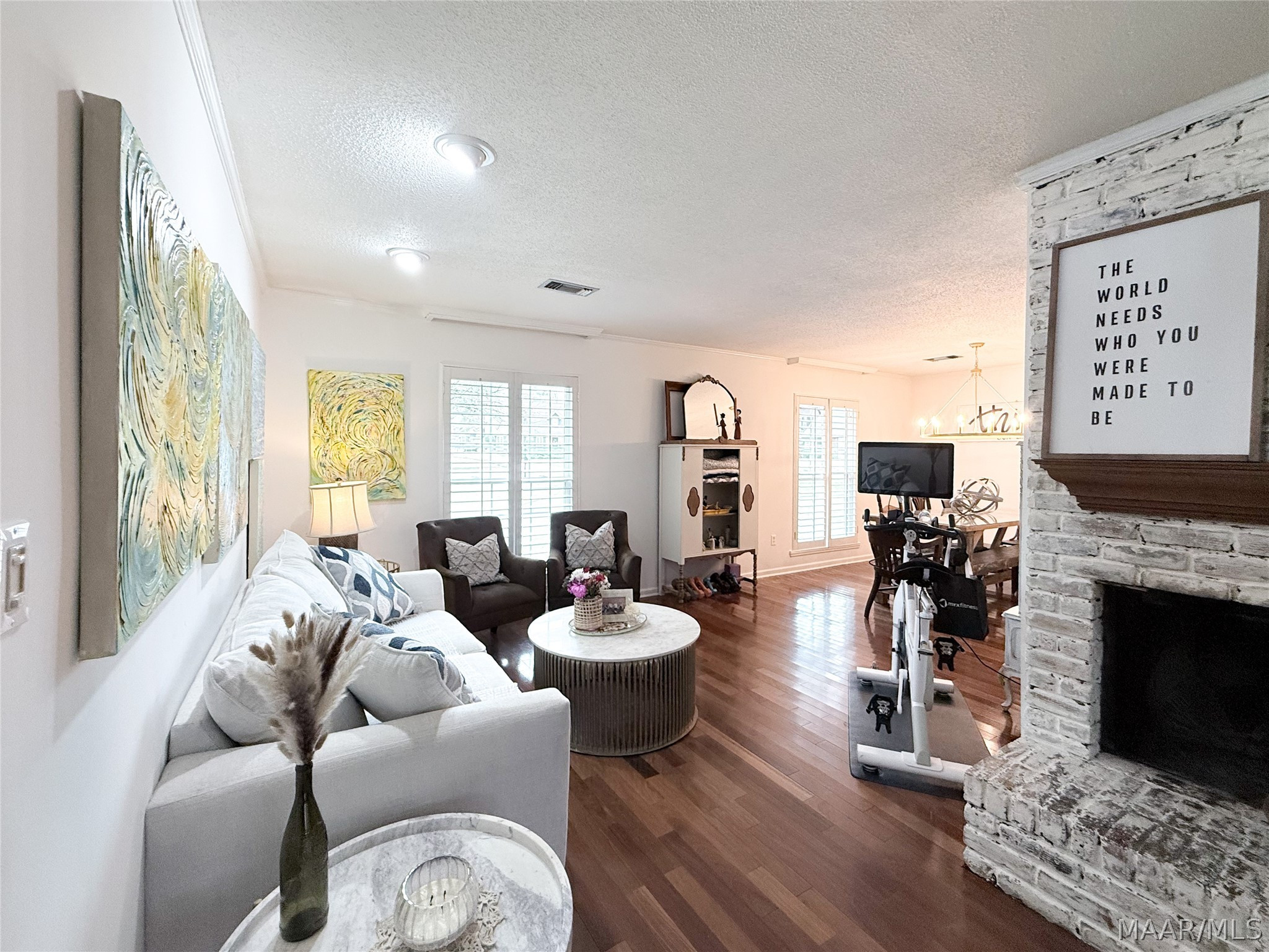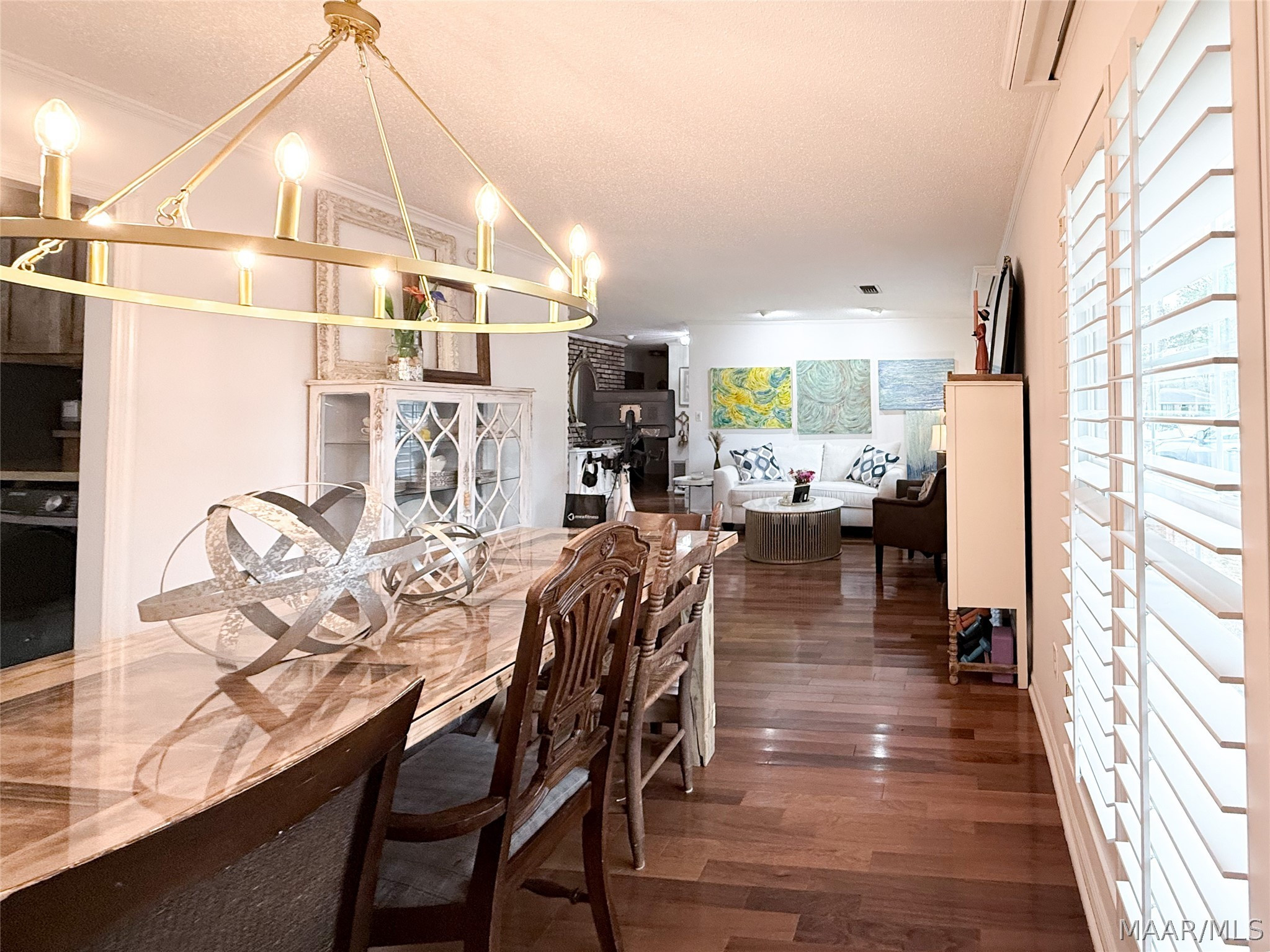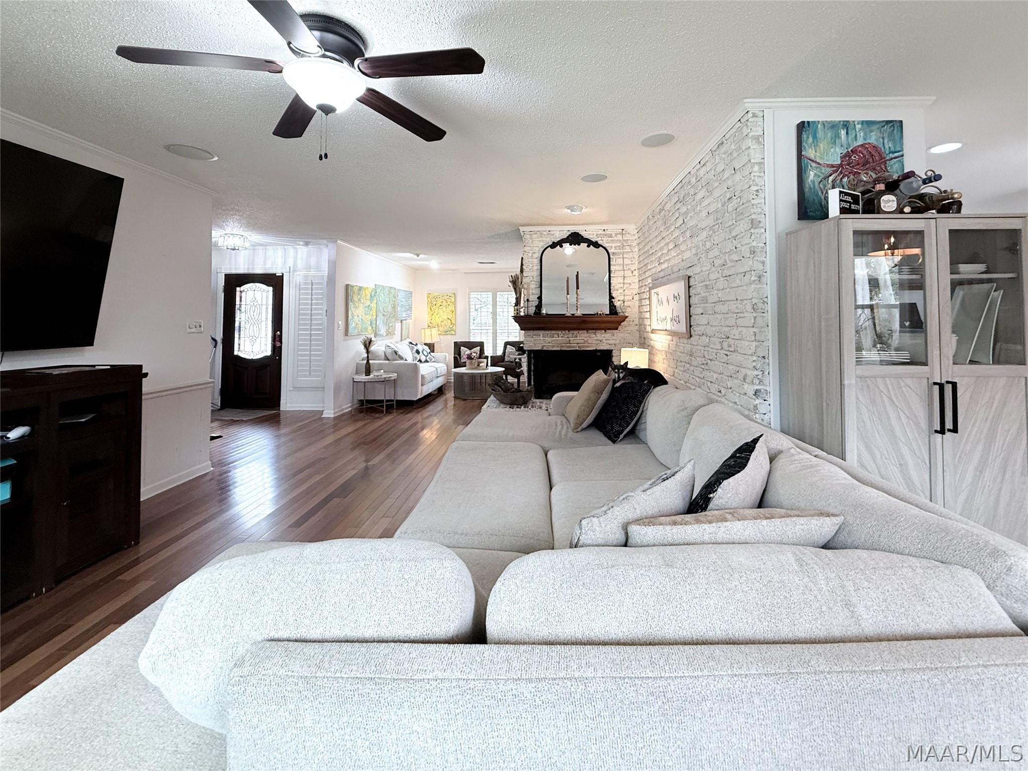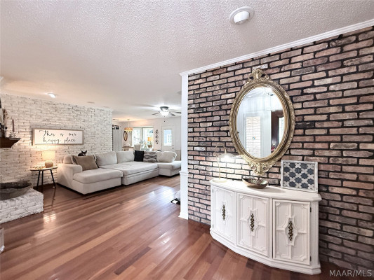 The spacious living room is the heart of the home, featuring a stunning wraparound brick fireplace, surround sound, and an extra-large window that fills the space with natural light and offers peaceful views of the backyard and pool. Just off the living area, the formal dining room flows seamlessly into an additional sitting area, perfect for a home office, reading nook, or flex space to fit your lifestyle.