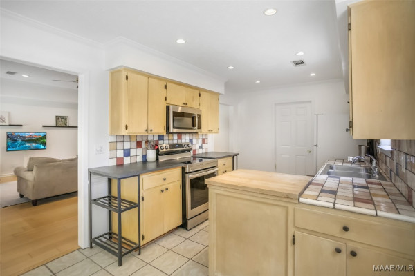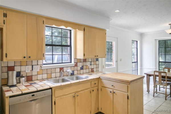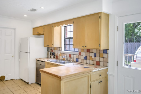 Tiled countertops and backsplash with a built-in cutting board countertop.