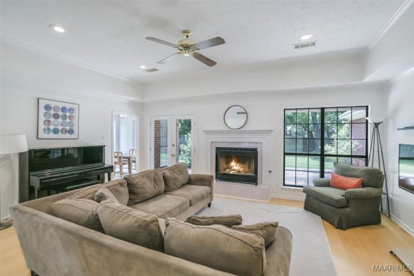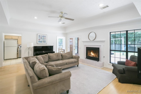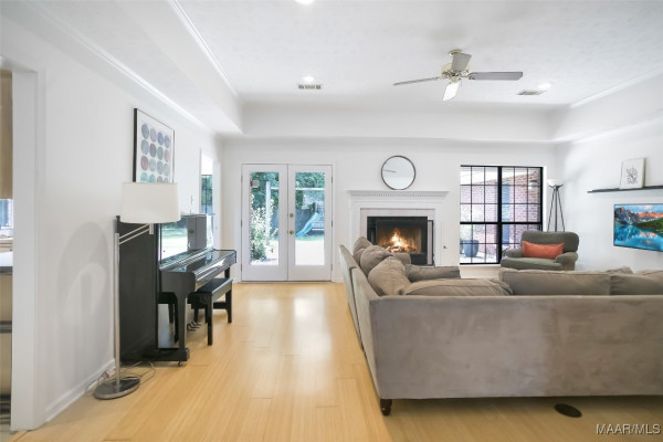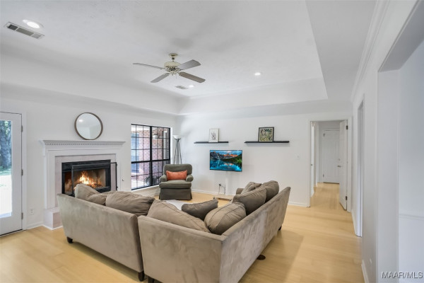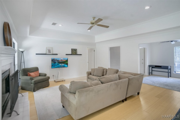 Spacious great room with a cozy fireplace and elegant box ceilings.