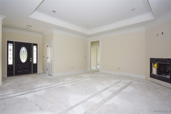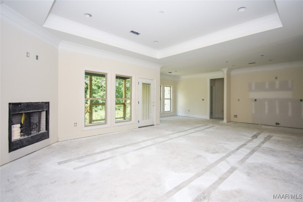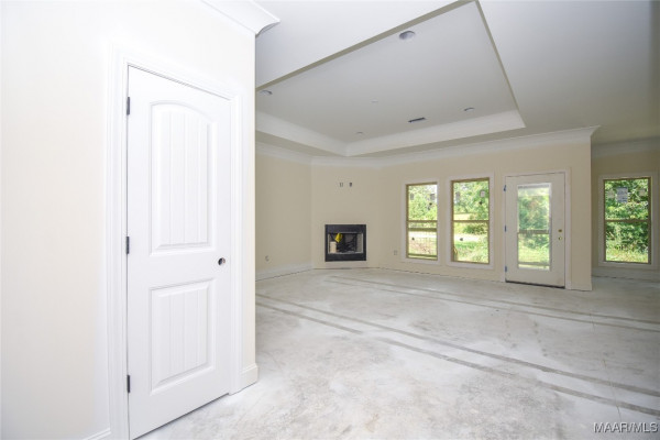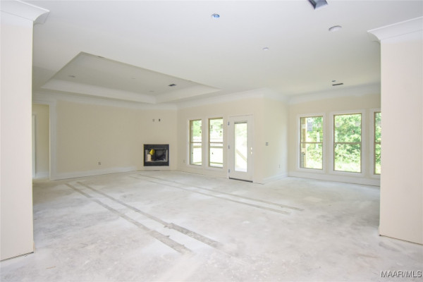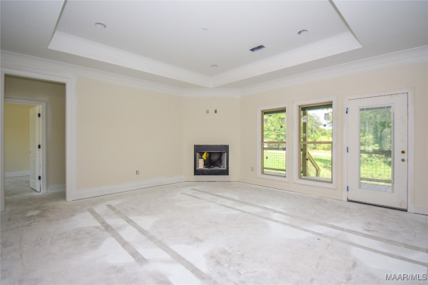 The inviting den includes a wood burning fireplace and tray ceiling, adding warmth and character to the living space.