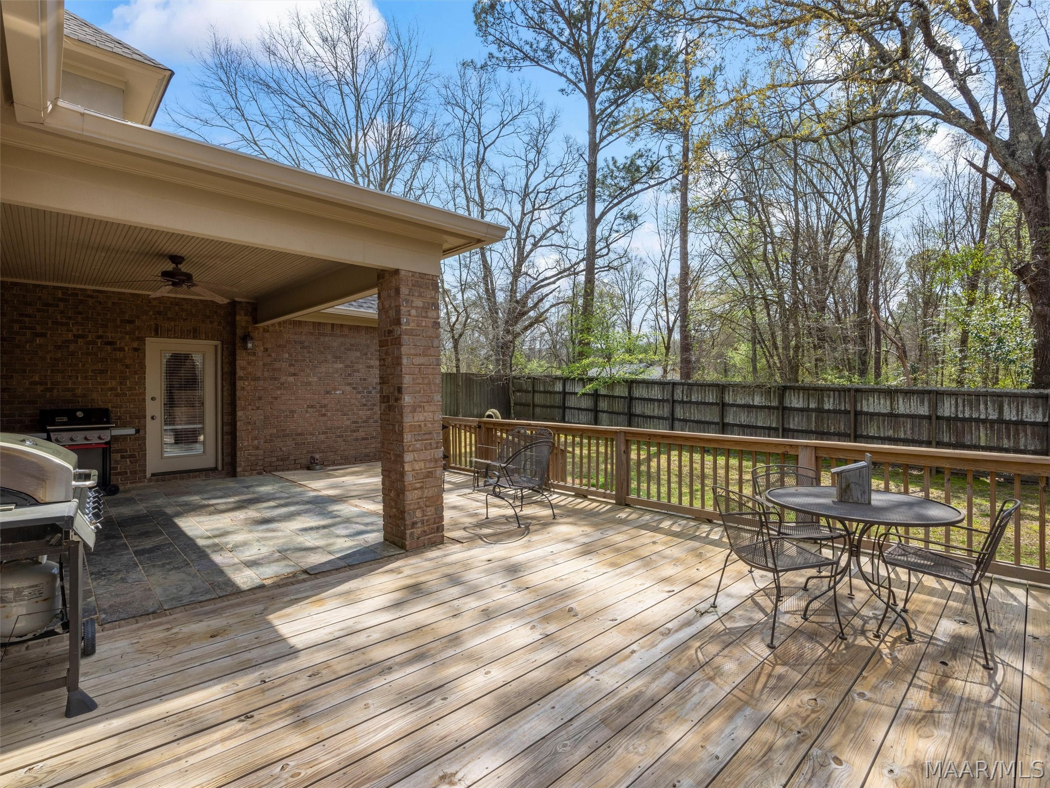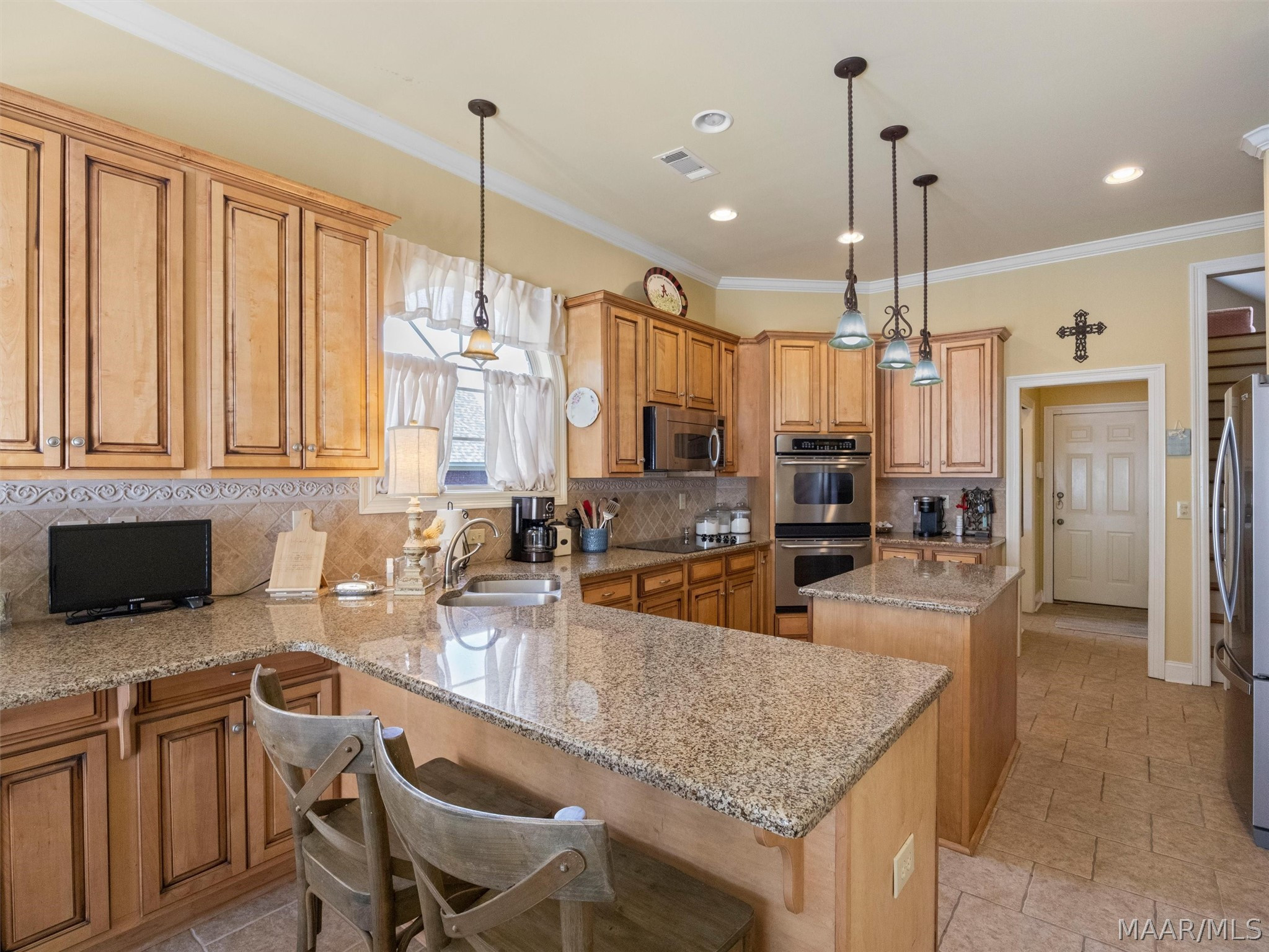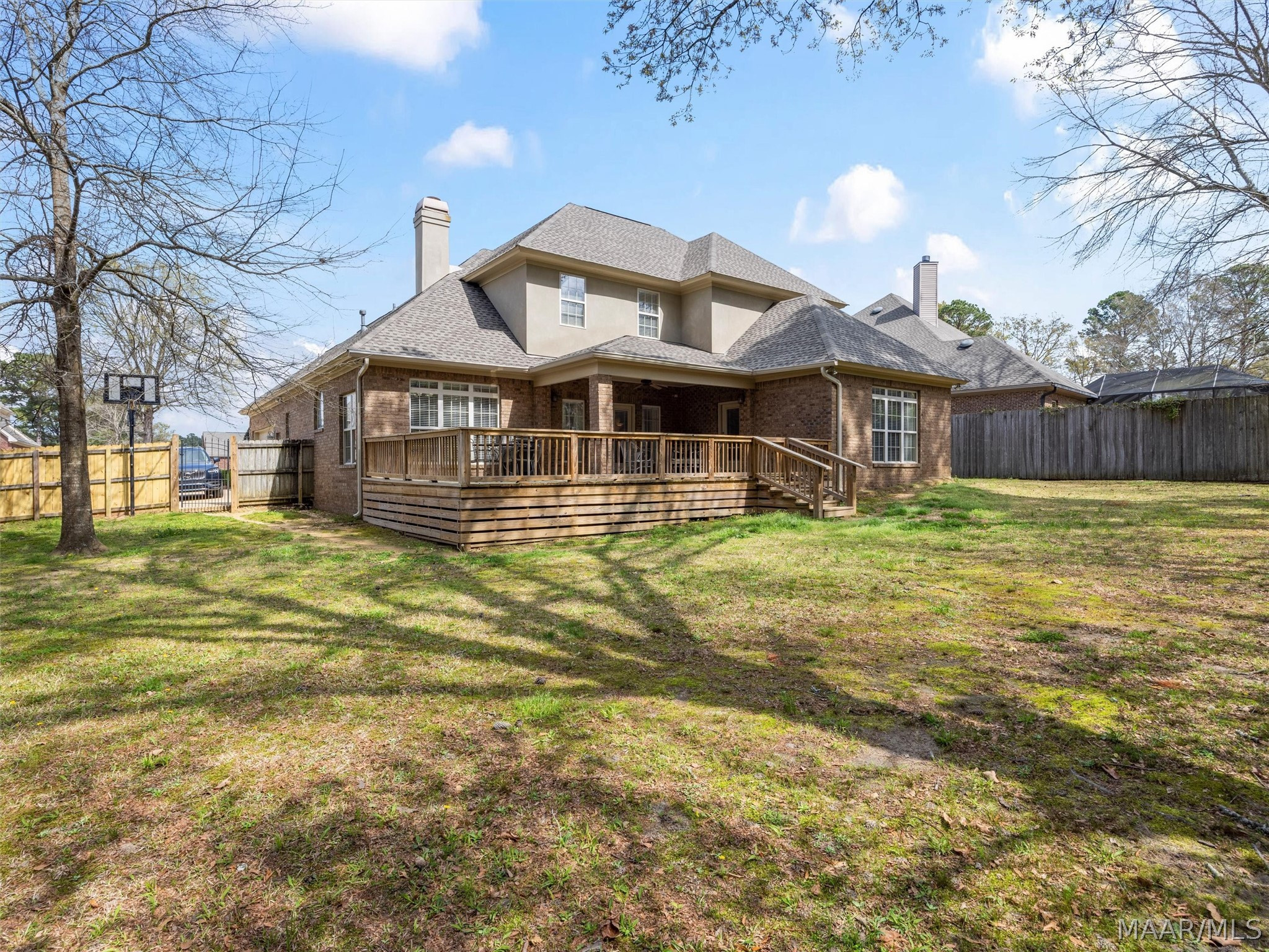 Custom-built by Blackwell Construction, this beautifully crafted 5-bedroom, 5-bath home offers exceptional space, quality, and thoughtful design throughout. The flexible floor plan features the private primary suite and a guest suite on the main level, while upstairs you’ll find three additional bedrooms, three baths, and a spacious bonus room. The downstairs guest suite currently used as a study, offers excellent privacy and separation from the primary suite. Inside, you’ll notice numerous upgraded details including high ceilings, crown molding, rounded corners, and elegant double tray ceilings in both the dining room and primary bedroom. The open layout is ideal for entertaining, with the dining room flowing seamlessly into the great room featuring a gas fireplace and French doors that open to a large covered patio and expansive wood deck. The kitchen is both stylish and functional, offering abundant cabinetry, granite countertops, a large granite work island, breakfast bar, stainless double ovens, microwave, a new cooktop (2025), and a new dishwasher (2021). The laundry room is well-equipped with built-in cabinets and a convenient utility sink. Just off the kitchen, a second staircase leads to the large bonus room—perfect for a media room, playroom, or additional living space. The primary bath provides a relaxing retreat with a jetted garden tub, double vanities, and a tiled shower with built-in seating. This one-owner home has been beautifully maintained with major updates including a new roof (2023), beautiful new LVP flooring (approx. 2022), and a New HVAC installed just last week with both systems professionally serviced twice a year . Schedule your showing today to see this move-in ready home!
