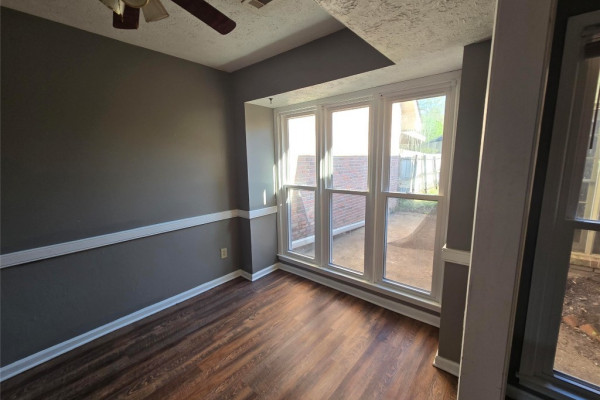 This townhouse is perfect for low yard maintenance and plenty of space. Features a large dining room to the left of the front door and the large living room straight ahead. The kitchen breakfast nook is open to the living room making it perfect for entertaining. Master bedroom is downstairs complete with walk-in-closet and bathroom with access to the hallway for guest access. Upstairs you’ll find 2 bedrooms complete with a nook below windows perfect for chair or desk. Hallway does have cabinet space perfect for all the blankets, sheets, and towels you may have. The bathroom does features brand new laminate wood floors that are scratch and water proof. Back yard is privacy fenced and a storage closet. PETS below 25 pounds welcome with $200/pet deposit. NO SMOKING INSIDE.