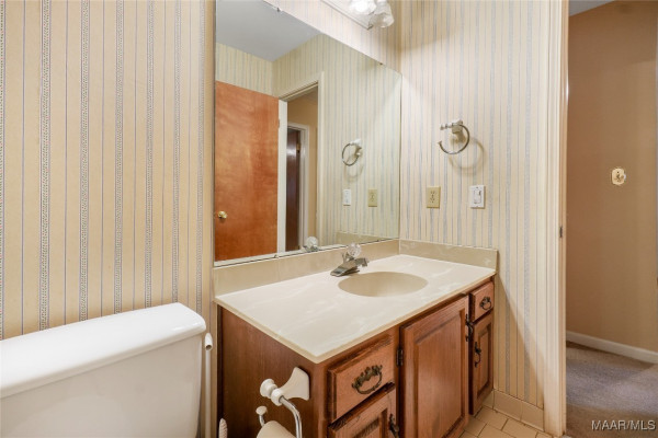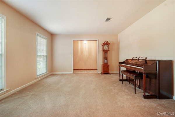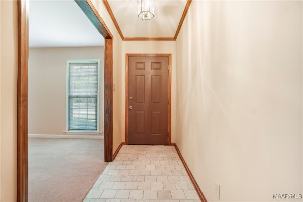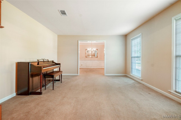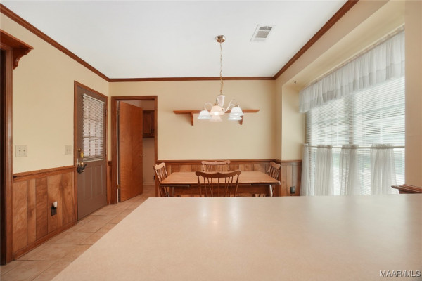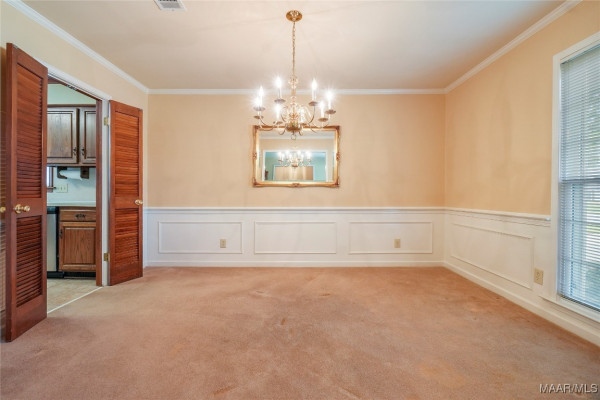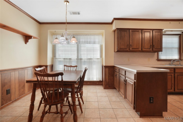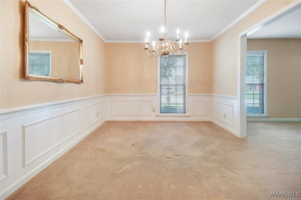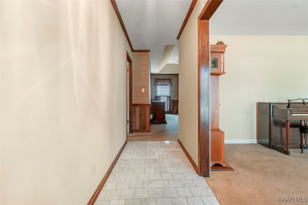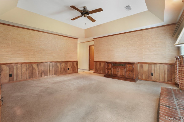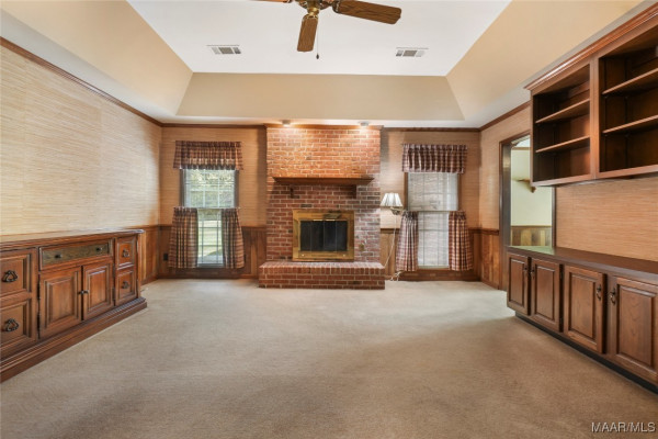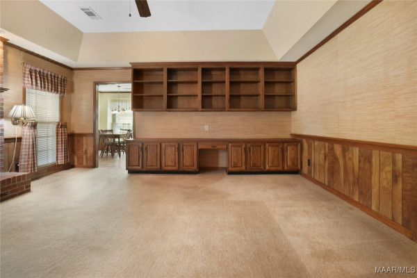 Step into a light-filled living room that flows seamlessly into a formal dining area—ideal for gatherings and special occasions. At the heart of the home, you’ll find a cozy family room featuring rich wood-paneled lower walls, textured grasscloth above, built-in bookcases, a desk nook, and a warm fireplace—perfect for relaxing evenings.
