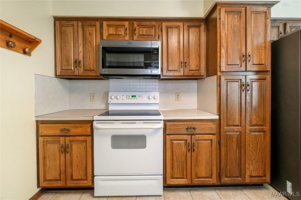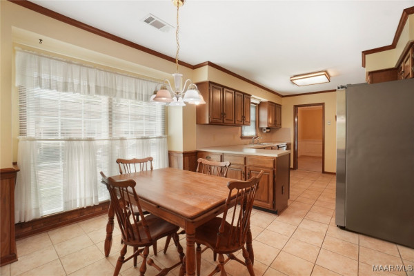 The kitchen boasts abundant counter space and cabinetry, a sunny breakfast area, and a brand-new Samsung refrigerator that stays with the home. Just off the kitchen, a large laundry room offers even more storage options, including extra cabinets and a pantry.