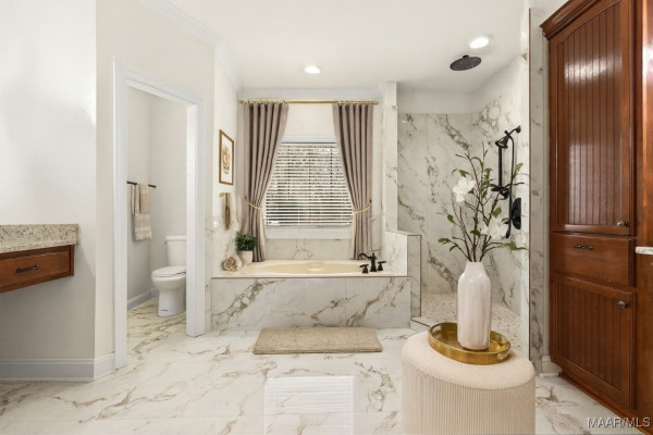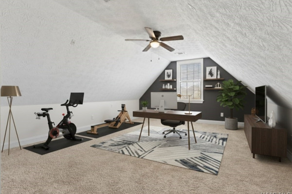 The main-level primary suite provides a private retreat with dual walk-in closets, a separate sitting area or home office, and a spa-style bath complete with dual vanities, a jetted tub, and a tiled walk-in shower. A guest bedroom and full bath on the main level add flexibility, while the upper level offers two additional bedrooms, a full bath, and a spacious bonus room perfect for media, recreation, or home workspace needs.