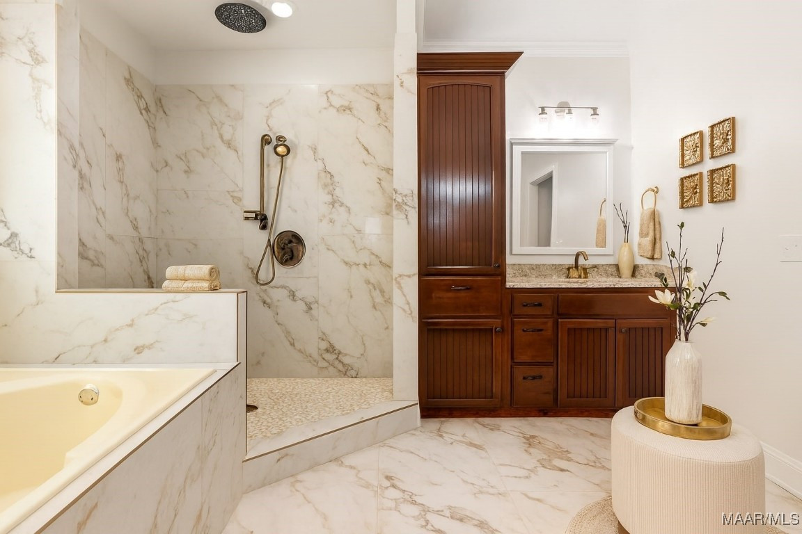 The main-level primary suite provides a private retreat with dual walk-in closets, a separate sitting area or home office, and a spa-style bath complete with dual vanities, a jetted tub, and a tiled walk-in shower. A guest bedroom and full bath on the main level add flexibility, while the upper level offers two additional bedrooms, a full bath, and a spacious bonus room perfect for media, recreation, or home workspace needs.