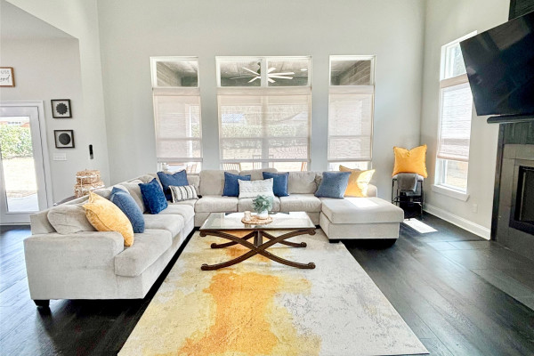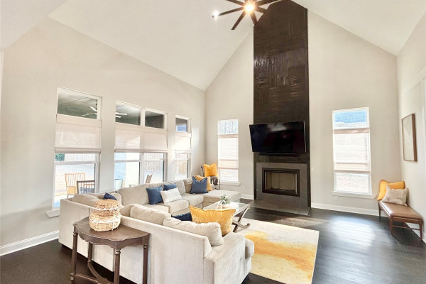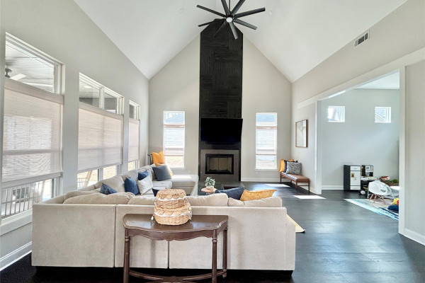 The living room is designed to impress and built to entertain. With its soaring vaulted ceilings, cozy gas fireplace, and tall windows overlooking the backyard, this space feels expansive and inviting. It opens seamlessly into the showstopping kitchen — a true centerpiece of the home.