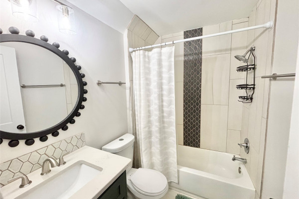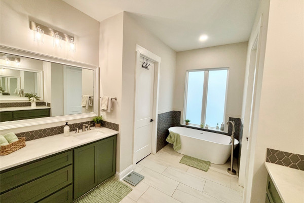 The primary suite is conveniently located downstairs, offering a private retreat with a glamorous and sleek bathroom featuring a freestanding deep soaking tub designed for relaxation. Upstairs additional bedrooms are generously sized.