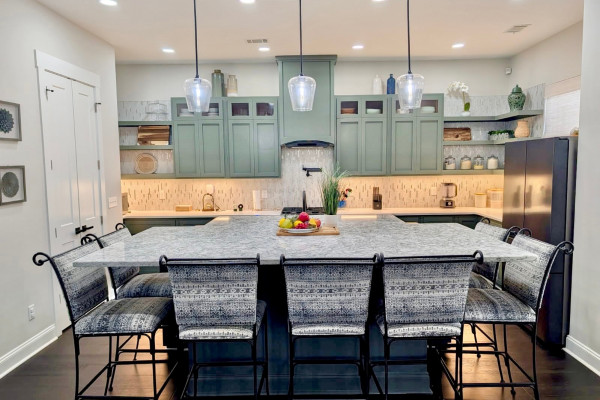 The designer kitchen features handmade solid wood cabinetry with soft-close drawers, a Lazy Susan, floating shelves, display cabinetry, and a convenient pot filler above the gas stove. Gorgeous quartz countertops highlight the oversized island, which comfortably seats seven — perfect for gatherings. A gas stove with grill completes this space.