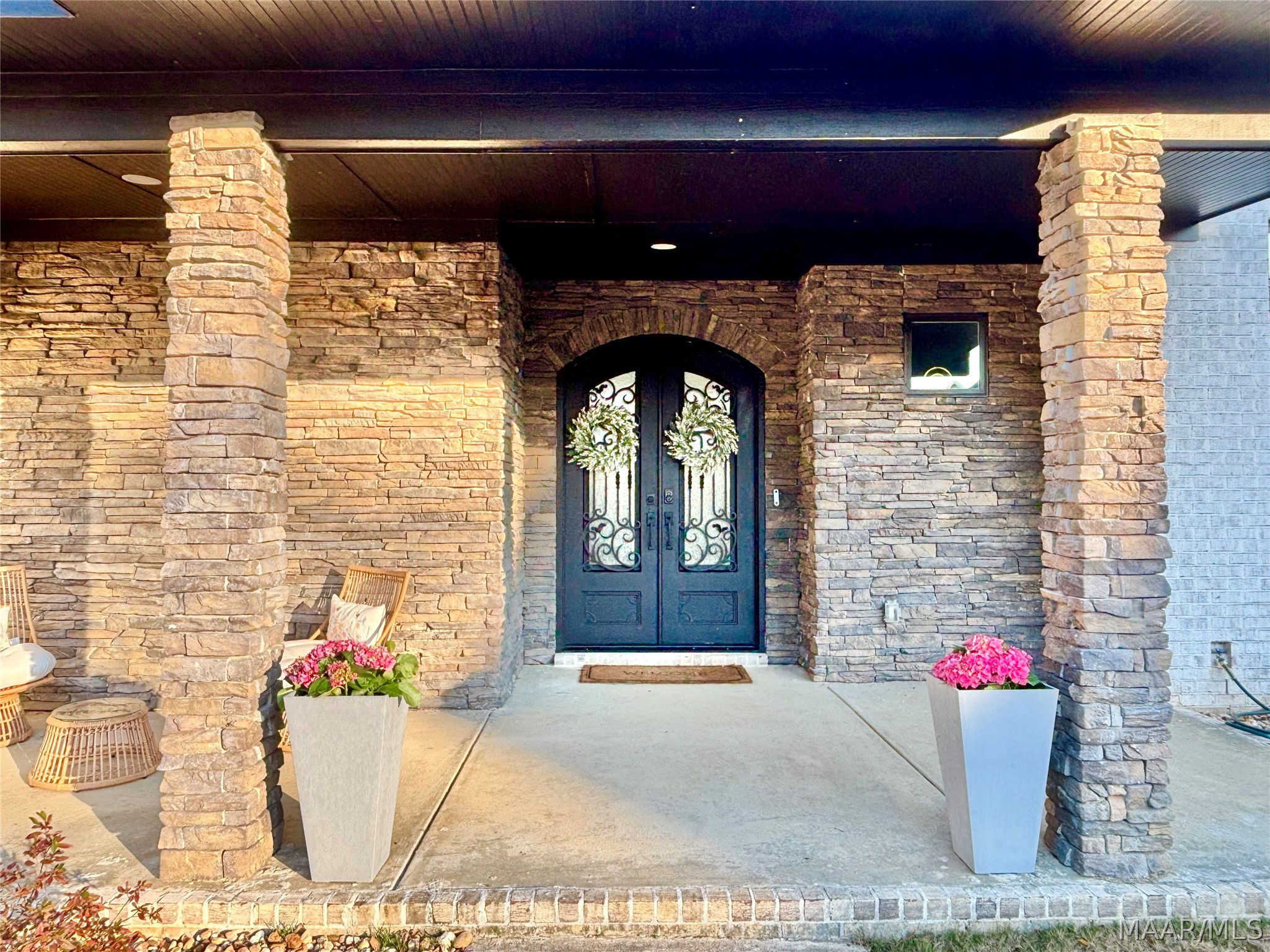 This stunning custom-built 4-bedroom, 3.5 bath, 1.5-story modern masterpiece blends luxury with everyday functionality. The dramatic front porch, with its stone columns, tall wood double front doors with elegant iron detailing invite you inside.