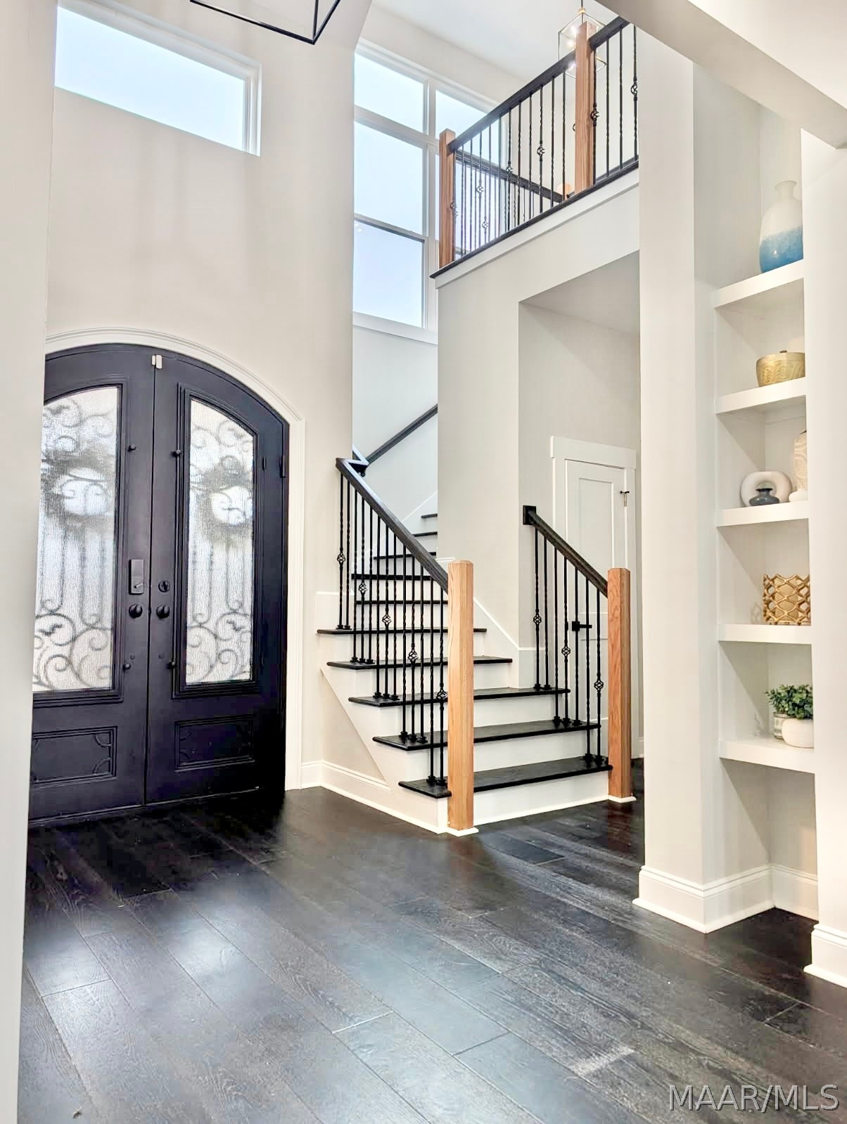 Step inside and you’re greeted by an eye-catching staircase, an open balcony overlook, and custom feature shelving. Engineered black hardwood flooring flows throughout most of the home, adding depth and sophistication, while 8-foot doorways create a grand, open feel throughout.