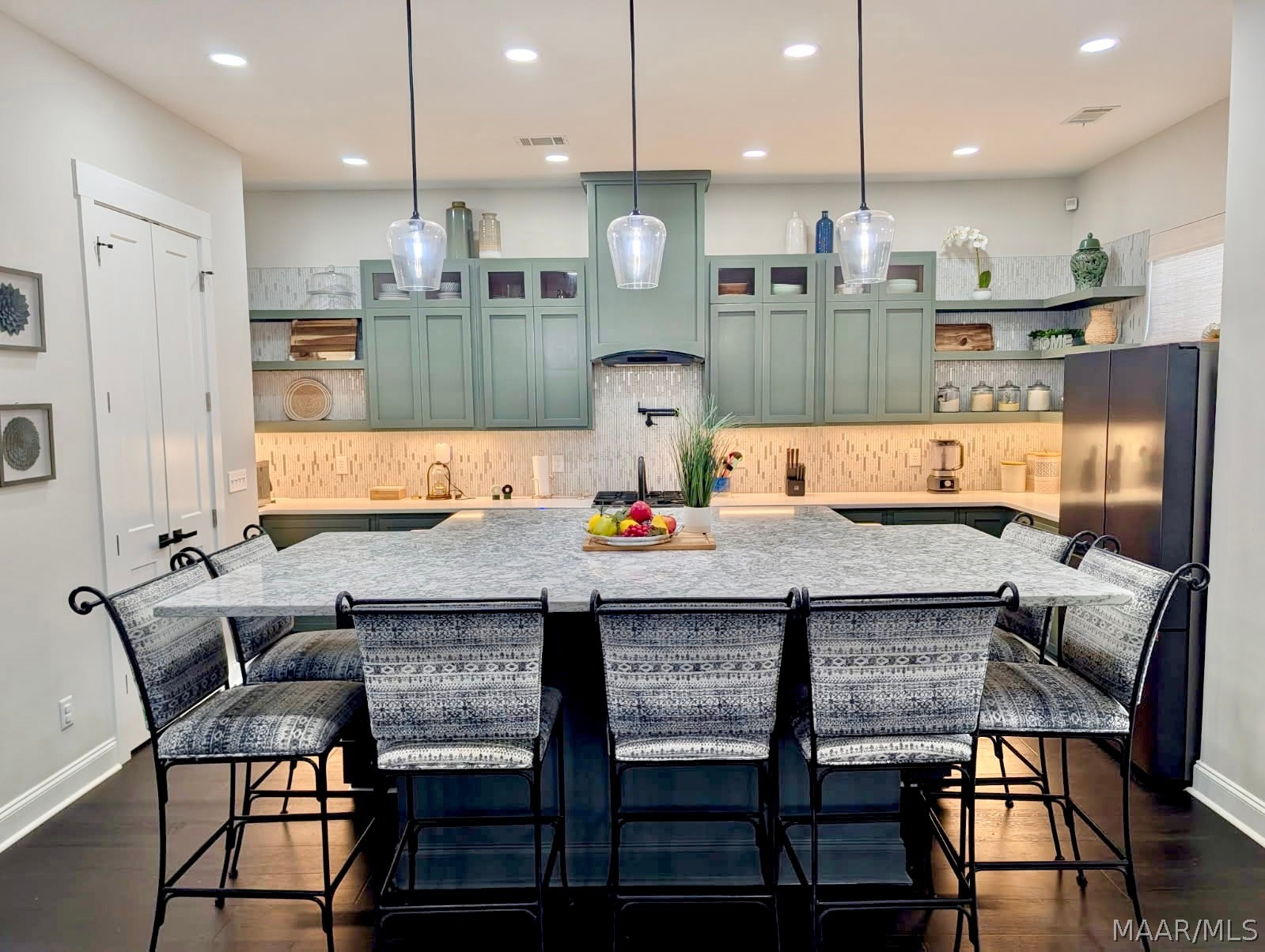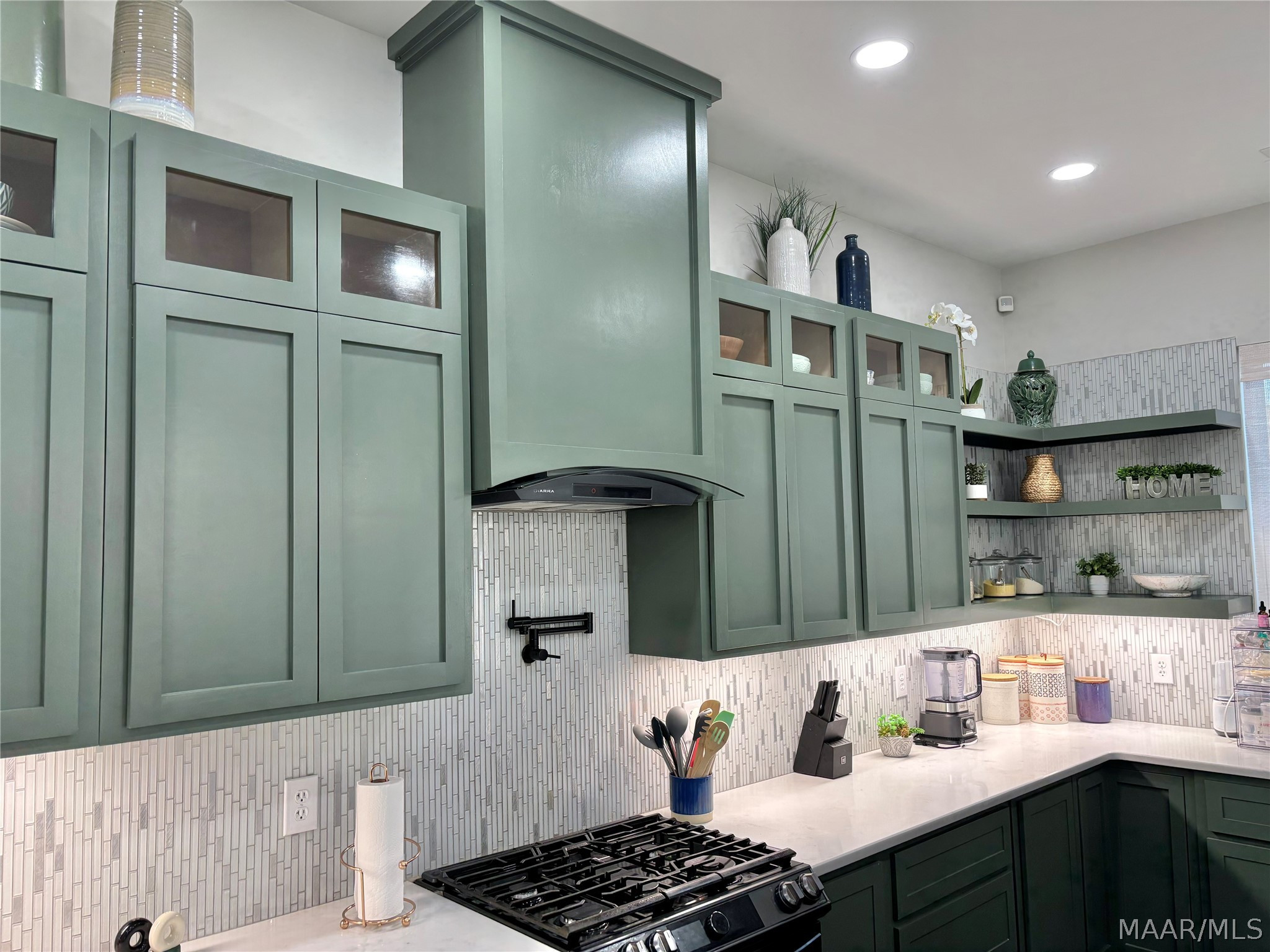 The designer kitchen features handmade solid wood cabinetry with soft-close drawers, a Lazy Susan, floating shelves, display cabinetry, and a convenient pot filler above the gas stove. Gorgeous quartz countertops highlight the oversized island, which comfortably seats seven — perfect for gatherings. A gas stove with grill completes this space.