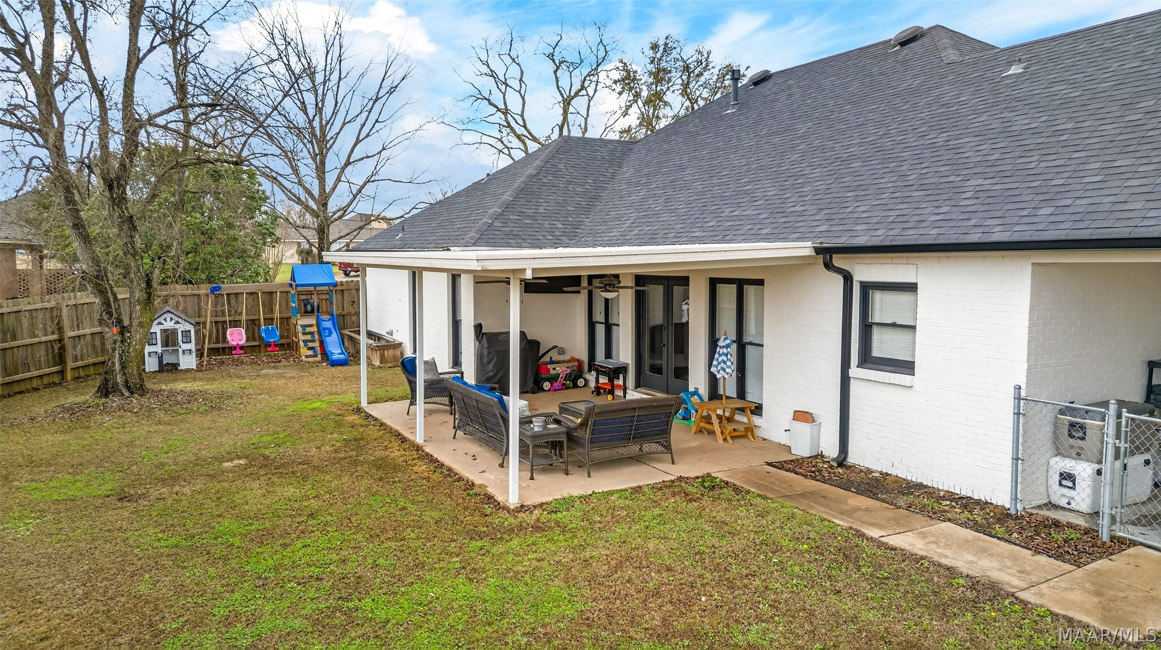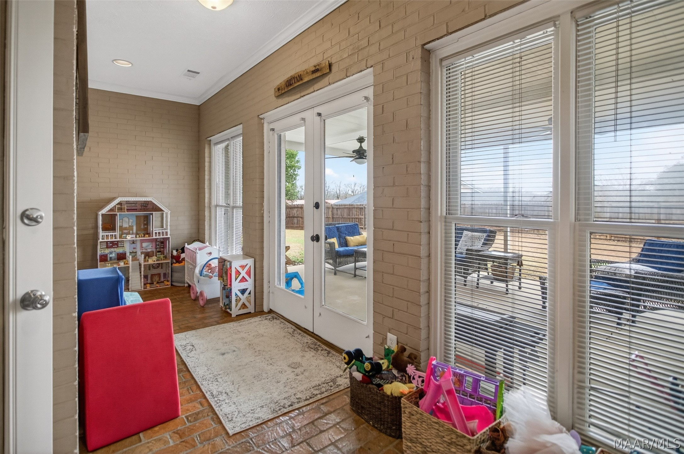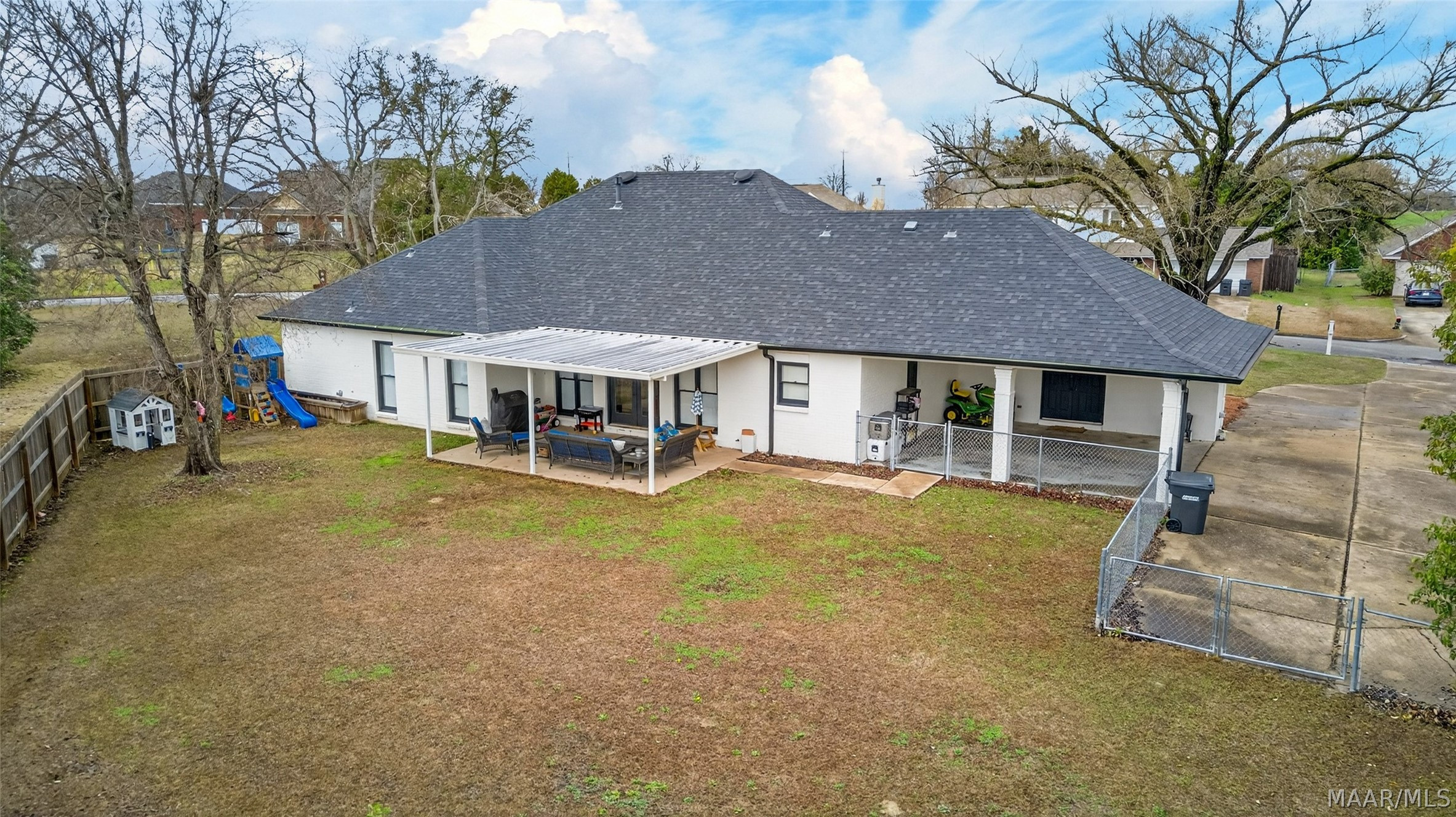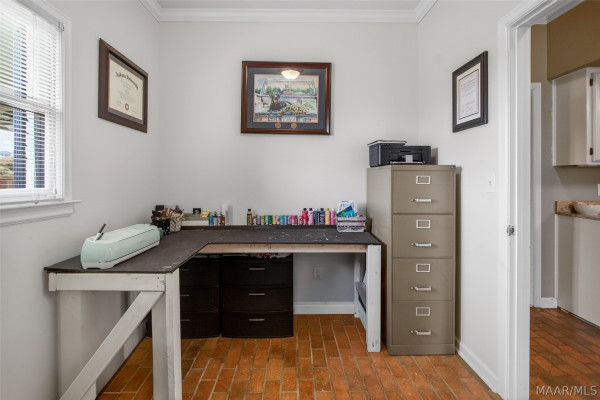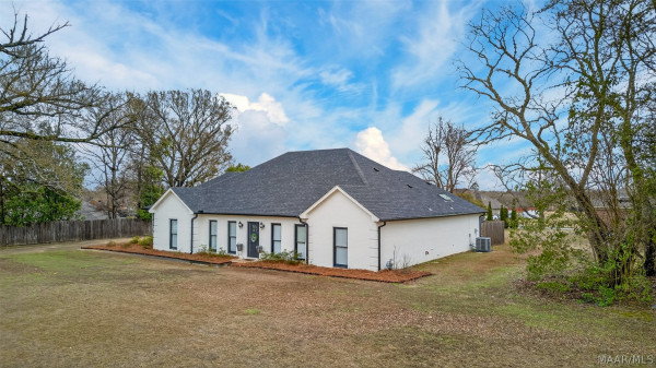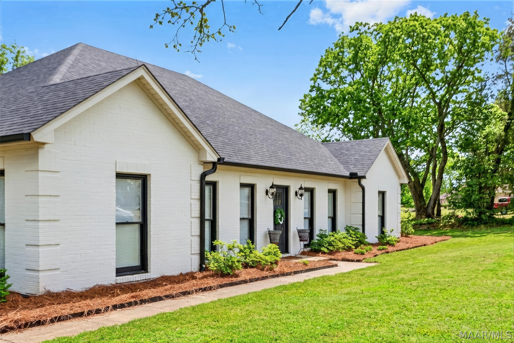 Exceptional curb appeal welcomes you to this beautiful 2,616 sq ft home in the desirable Rolling Hills Subdivision, zoned for Pike Road Schools. The home makes a striking first impression with its white painted brick exterior and bold black windows, creating a timeless statement of charm and understated elegance. This well-maintained home offers numerous updates and thoughtful details throughout. Recent improvements include a new roof in 2021, HVAC replacement in 2019, new carpet, interior paint, front windows, gutters, along with new flooring in the dining room. The kitchen features granite countertops, abundant cabinetry, pantry, breakfast area, and stainless steel appliances installed in 2019. All kitchen appliances to remain. Just off the kitchen is a dedicated office with beautiful brick floors that flow seamlessly from the kitchen, adding warmth and character. A separate laundry room is conveniently located nearby, and the washer and dryer will remain with the home. The spacious family room includes a ventless gas log fireplace and opens to a truly stunning sunroom with painted brick walls and original brick flooring, overlooking the backyard. Enjoy outdoor living on the back porch with a gas hookup for grilling, ceiling fans added in 2023, and a TV that remains for endless entertainment. The primary suite is generously sized and offers a spa-like bath with garden tub, separate shower, skylight, double vanity, and his and her closets. Two additional bedrooms provide great space, and the hall bath features a double vanity with a separate shower and commode area. For parking, there is a two-car carport with an attached storage room featuring a sink, cabinets, and built-in storage. A privacy fence added in 2023. The property has an underground sprinkler system as well. Less than 1 mile away from Cottonwood Golf Club, this home offers comfort, functionality, and thoughtful updates throughout — a must-see in Rolling Hills.