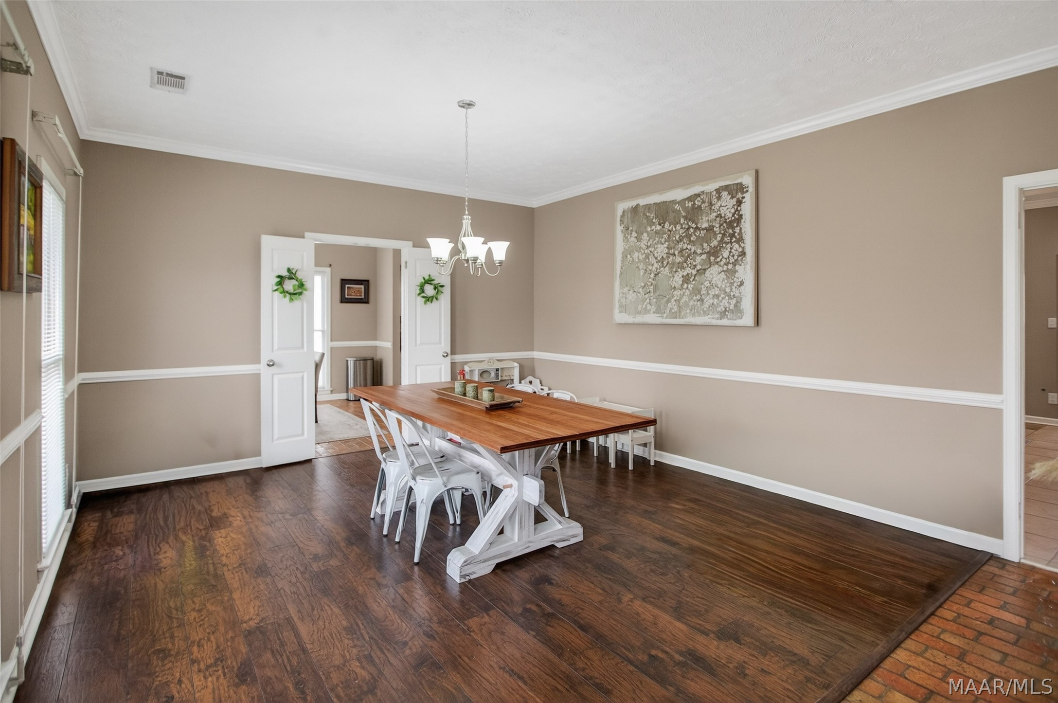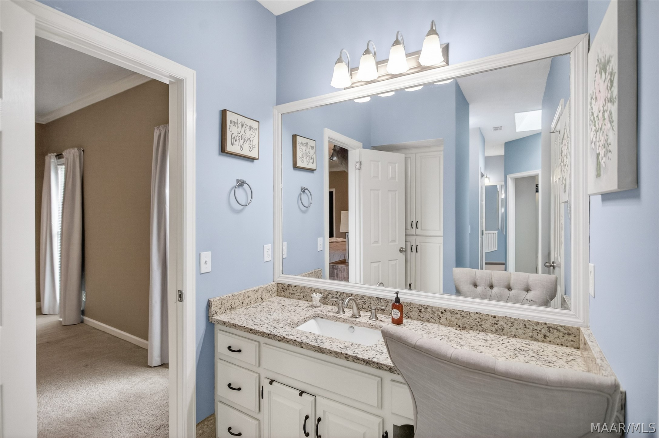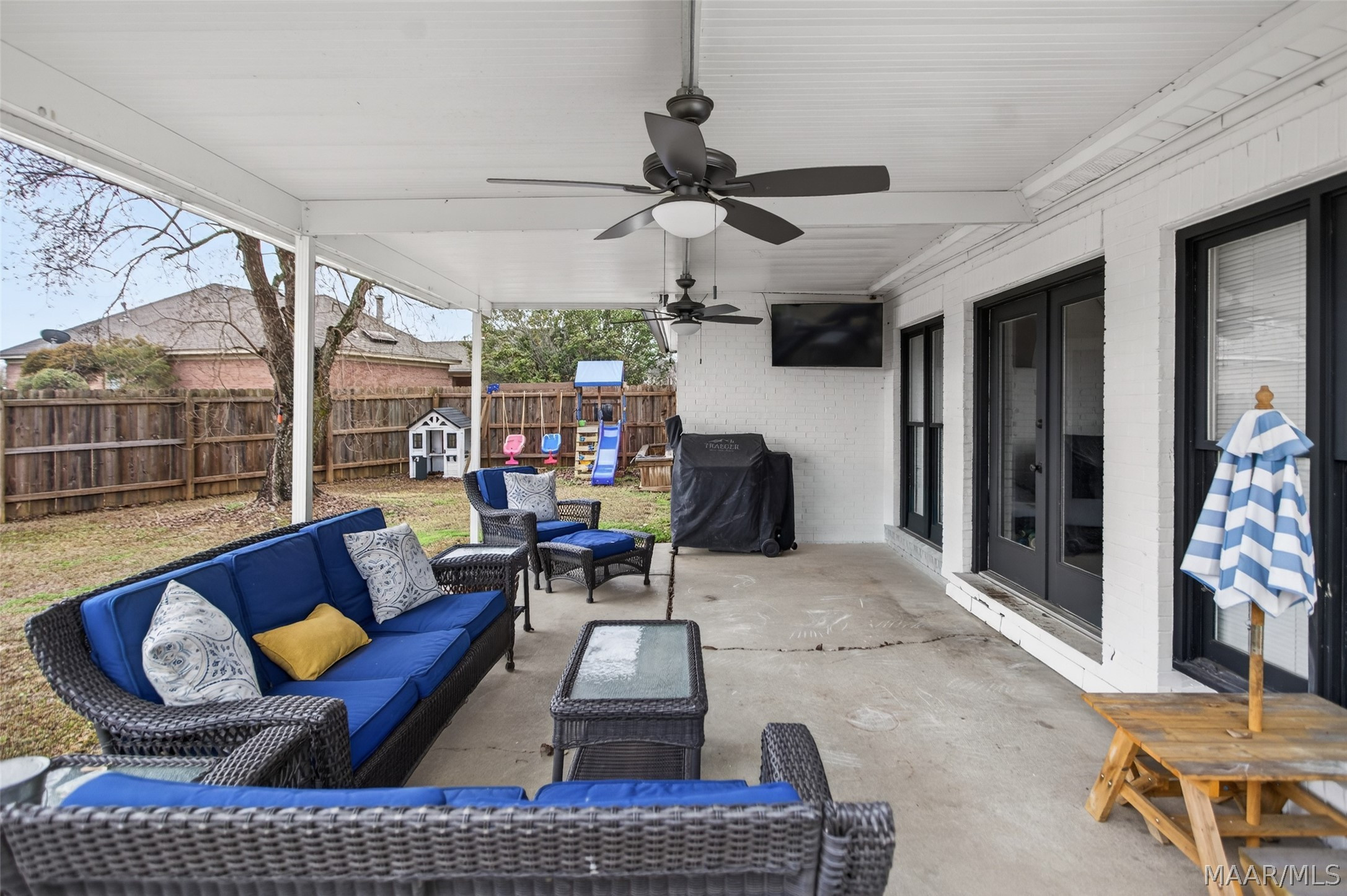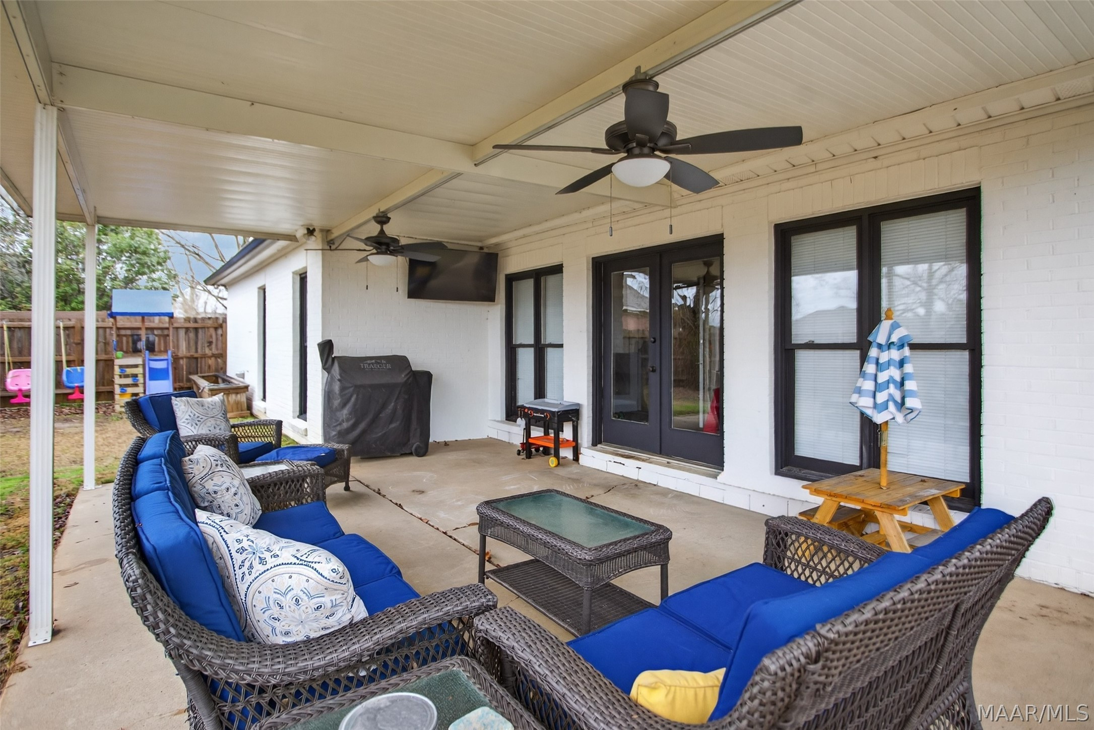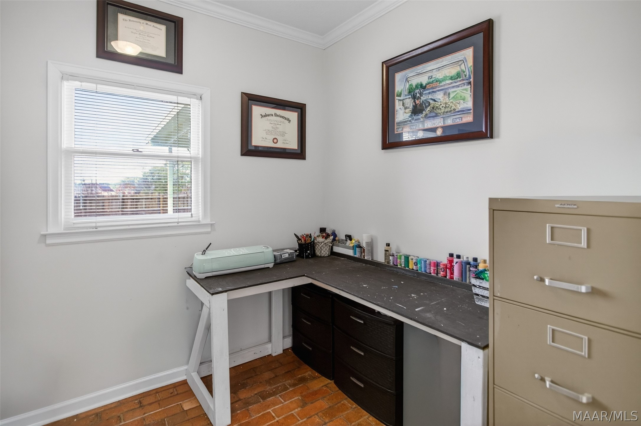 Exceptional curb appeal welcomes you to this beautiful 2,616 sq ft home in the desirable Rolling Hills Subdivision, zoned for Pike Road Schools. The home makes a striking first impression with its white painted brick exterior and bold black windows, creating a timeless statement of charm and understated elegance. This well-maintained home offers numerous updates and thoughtful details throughout. Recent improvements include a new roof in 2021, HVAC replacement in 2019, new carpet, interior paint, front windows, gutters, along with new flooring in the dining room. The kitchen features granite countertops, abundant cabinetry, pantry, breakfast area, and stainless steel appliances installed in 2019. All kitchen appliances to remain. Just off the kitchen is a dedicated office with beautiful brick floors that flow seamlessly from the kitchen, adding warmth and character. A separate laundry room is conveniently located nearby, and the washer and dryer will remain with the home. The spacious family room includes a ventless gas log fireplace and opens to a truly stunning sunroom with painted brick walls and original brick flooring, overlooking the backyard. Enjoy outdoor living on the back porch with a gas hookup for grilling, ceiling fans added in 2023, and a TV that remains for endless entertainment. The primary suite is generously sized and offers a spa-like bath with garden tub, separate shower, skylight, double vanity, and his and her closets. Two additional bedrooms provide great space, and the hall bath features a double vanity with a separate shower and commode area. For parking, there is a two-car carport with an attached storage room featuring a sink, cabinets, and built-in storage. A privacy fence added in 2023. The property has an underground sprinkler system as well. Less than 1 mile away from Cottonwood Golf Club, this home offers comfort, functionality, and thoughtful updates throughout — a must-see in Rolling Hills.