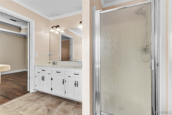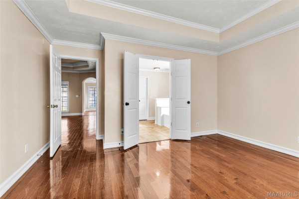 The living room features a stunning vaulted ceiling and a graceful arched doorway that leads into a warm, welcoming kitchen. The master bedroom includes a spacious bathroom and a generous walk-in closet.
