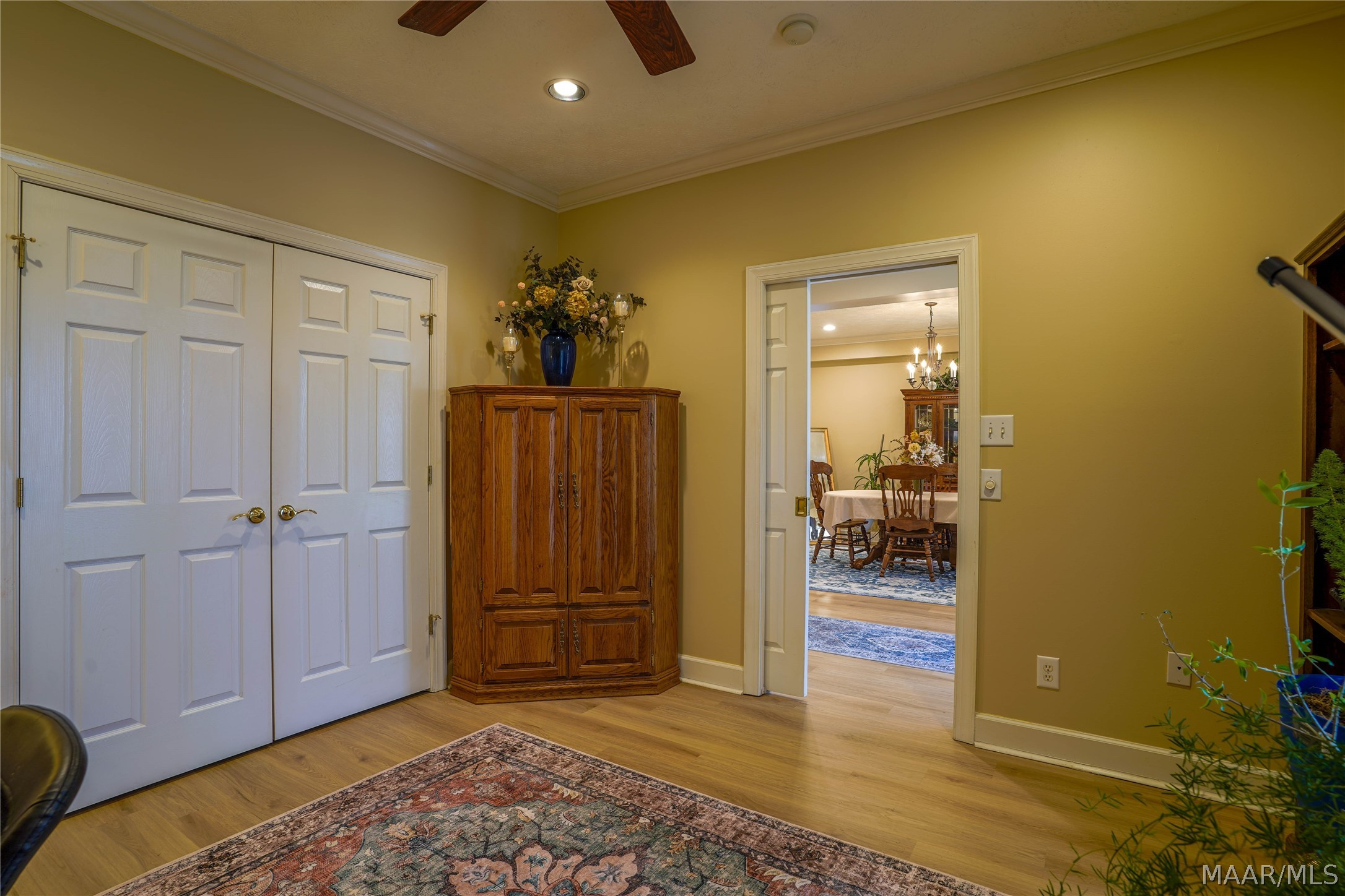 Step inside to discover a beautifully updated interior featuring new luxury vinyl flooring throughout, complemented by plush new carpeting in the primary suite and guest bedroom. The flexible office space, currently used as a large walk-in pantry, provides plenty of room for working from home or additional storage needs.