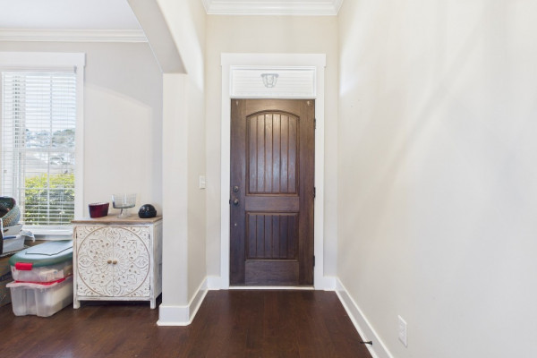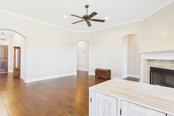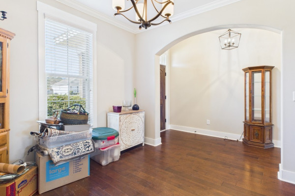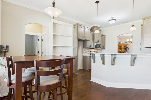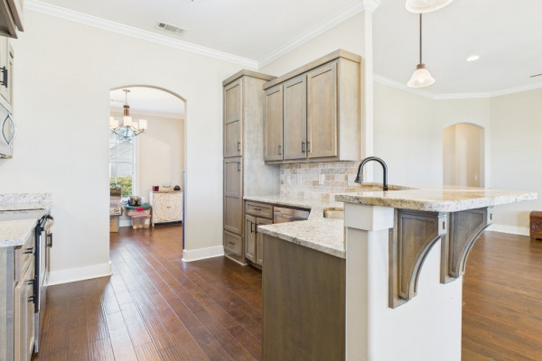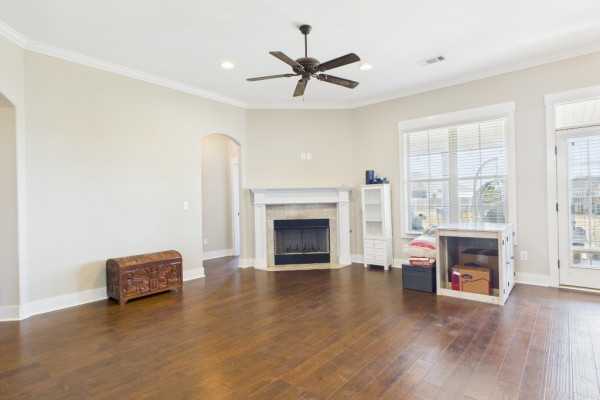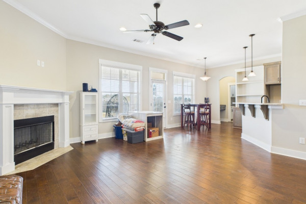 Inside, you’ll find elegant finishes throughout, including hardwood floors, granite countertops, 12-ft ceilings, and impressive crown molding. The kitchen overlooks a bright breakfast area and flows seamlessly into the living room, where a cozy gas fireplace creates the perfect gathering space. A separate formal dining room adds flexibility for entertaining or holiday meals.