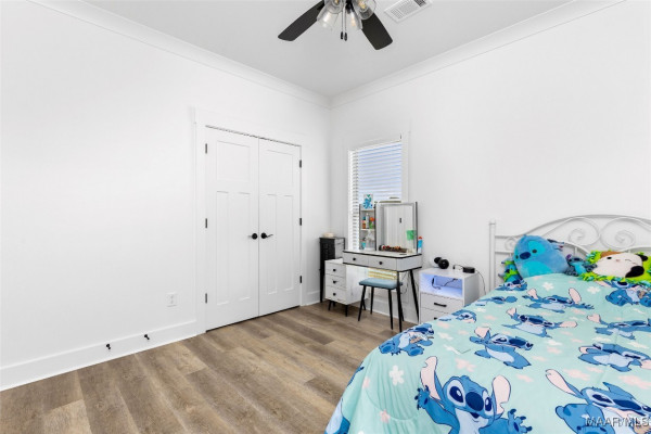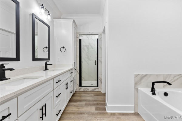 The private primary suite features a garden tub, separate shower, double vanities, and a walk-in closet. On the opposite side of the home, you’ll find three spacious guest bedrooms and a guest bath with double vanities and a tub/shower combo.