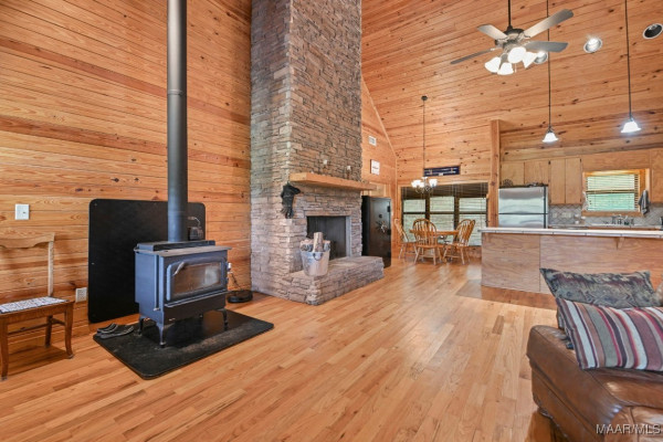 Step inside to discover an open-concept floor plan featuring 3 bedrooms, 2 baths, and a spacious loft perfect for a second living area or flex space. The great room is highlighted by a stunning floor-to-ceiling stone fireplace and a cozy wood-burning stove, creating the perfect gathering spot on cool evenings.