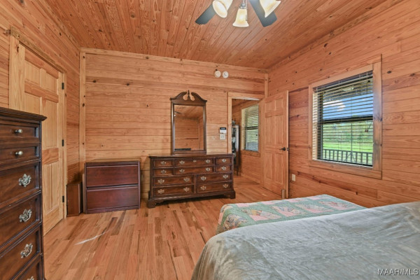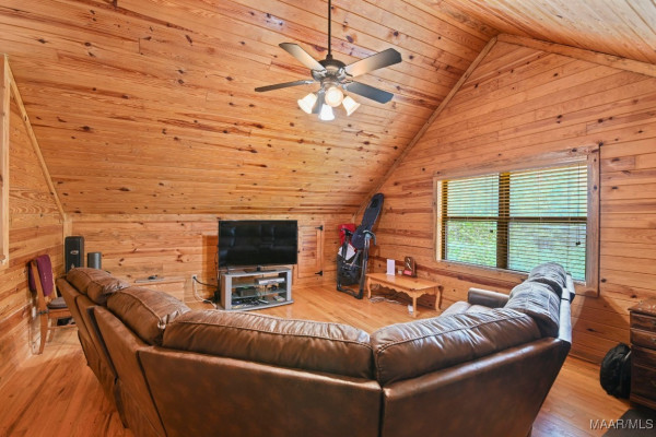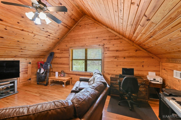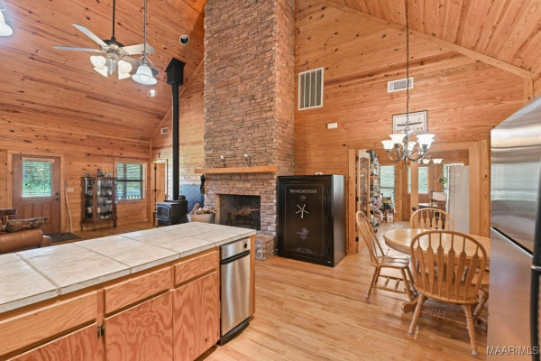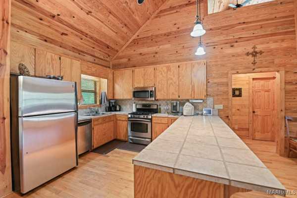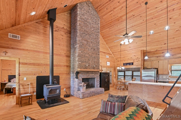 The home boasts real hardwood floors, a gas stovetop with electric oven, and tile countertops in the kitchen, along with a large laundry and pantry combo for convenience. Natural wood ceilings with exposed beams and plenty of windows fill the space with warmth and light.
