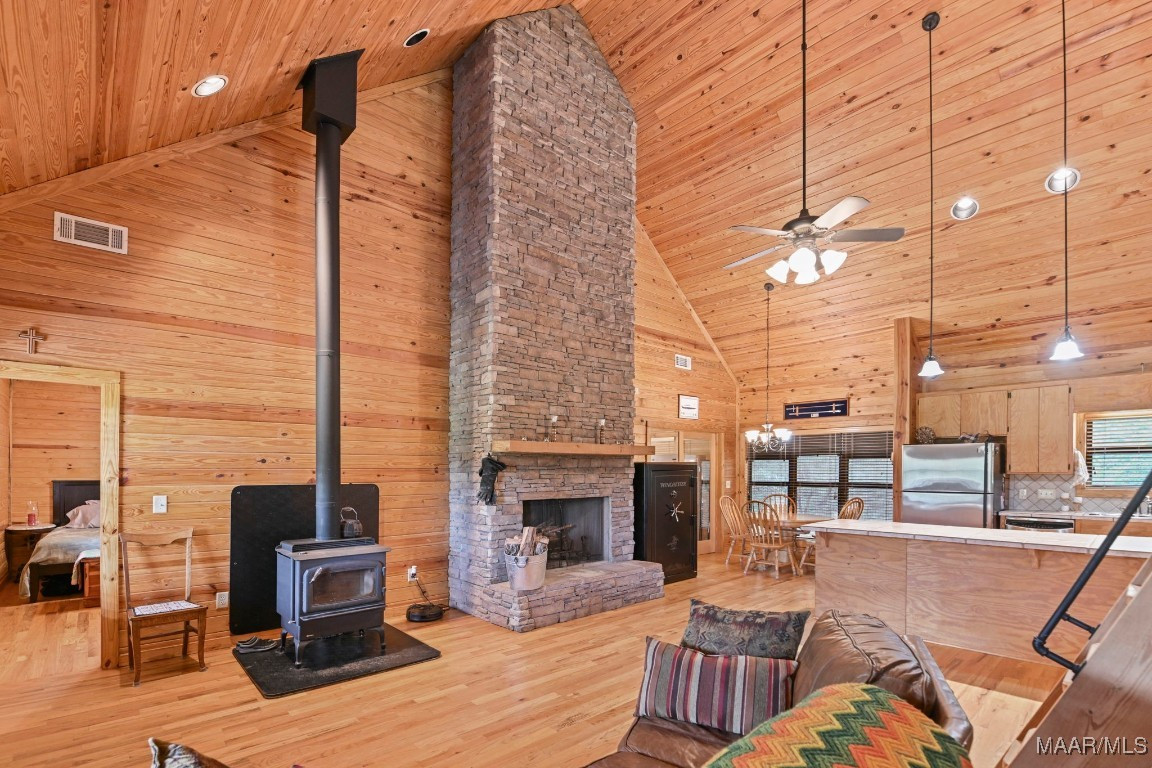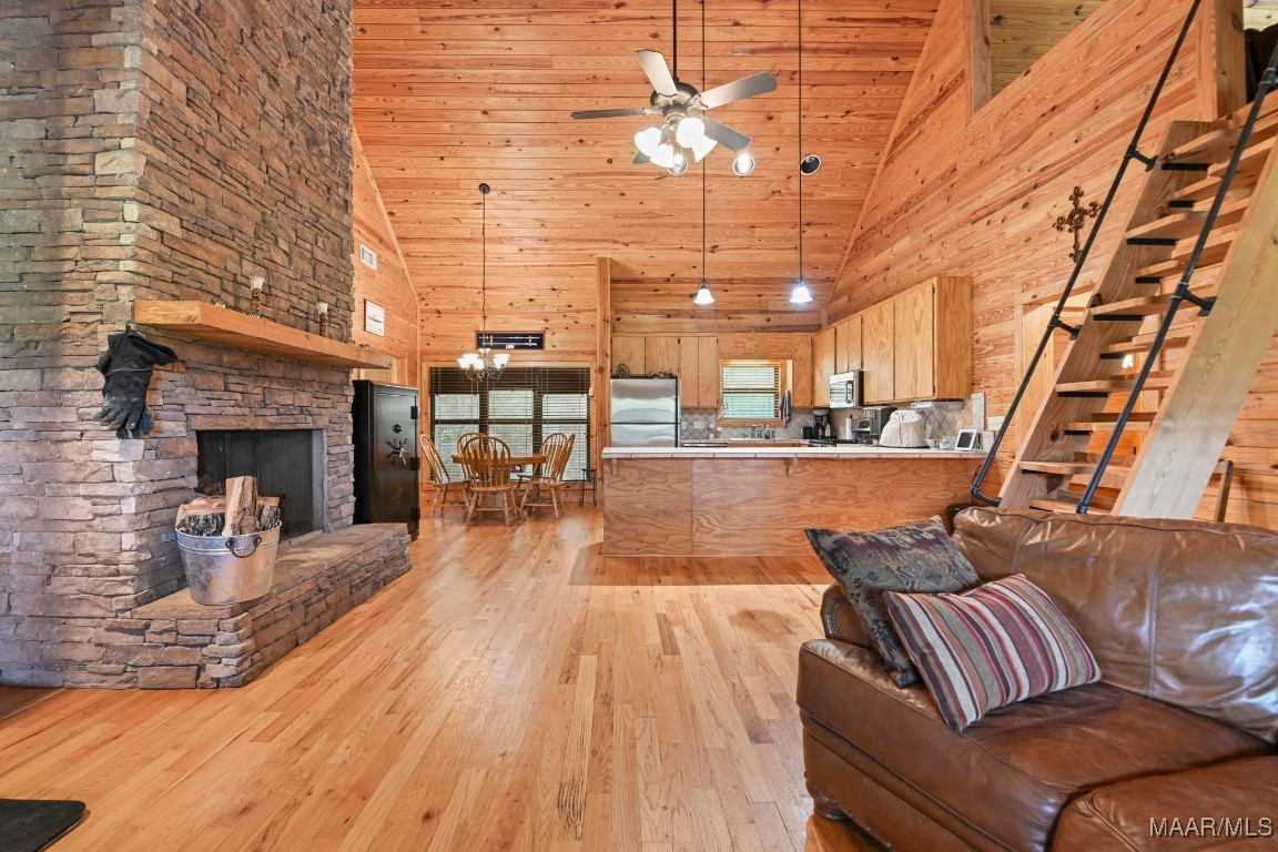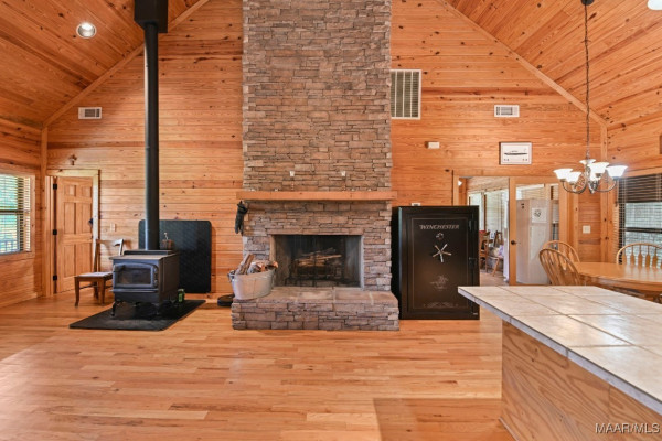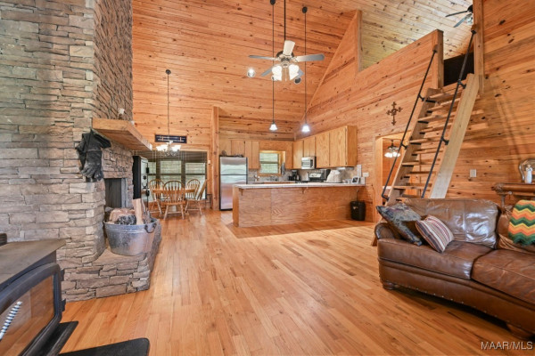 Step inside to discover an open-concept floor plan featuring 3 bedrooms, 2 baths, and a spacious loft perfect for a second living area or flex space. The great room is highlighted by a stunning floor-to-ceiling stone fireplace and a cozy wood-burning stove, creating the perfect gathering spot on cool evenings.