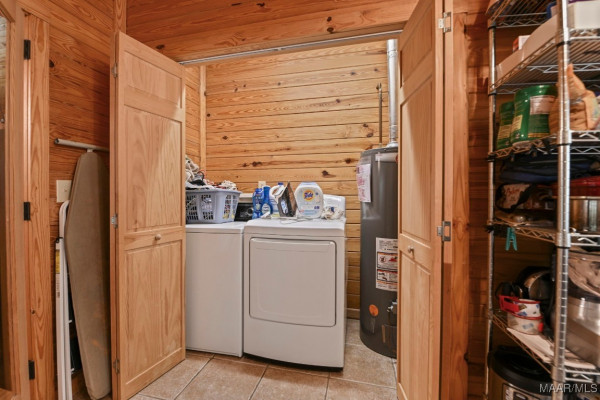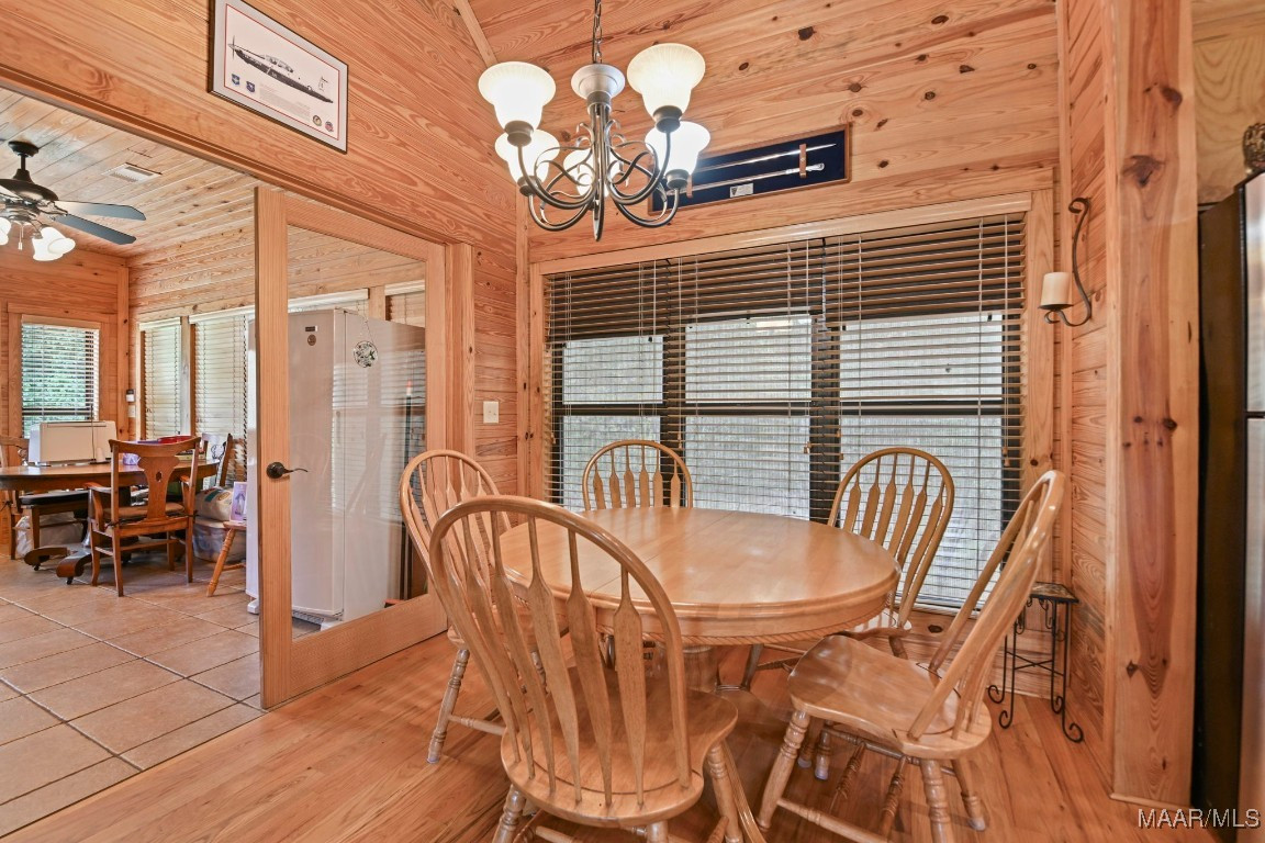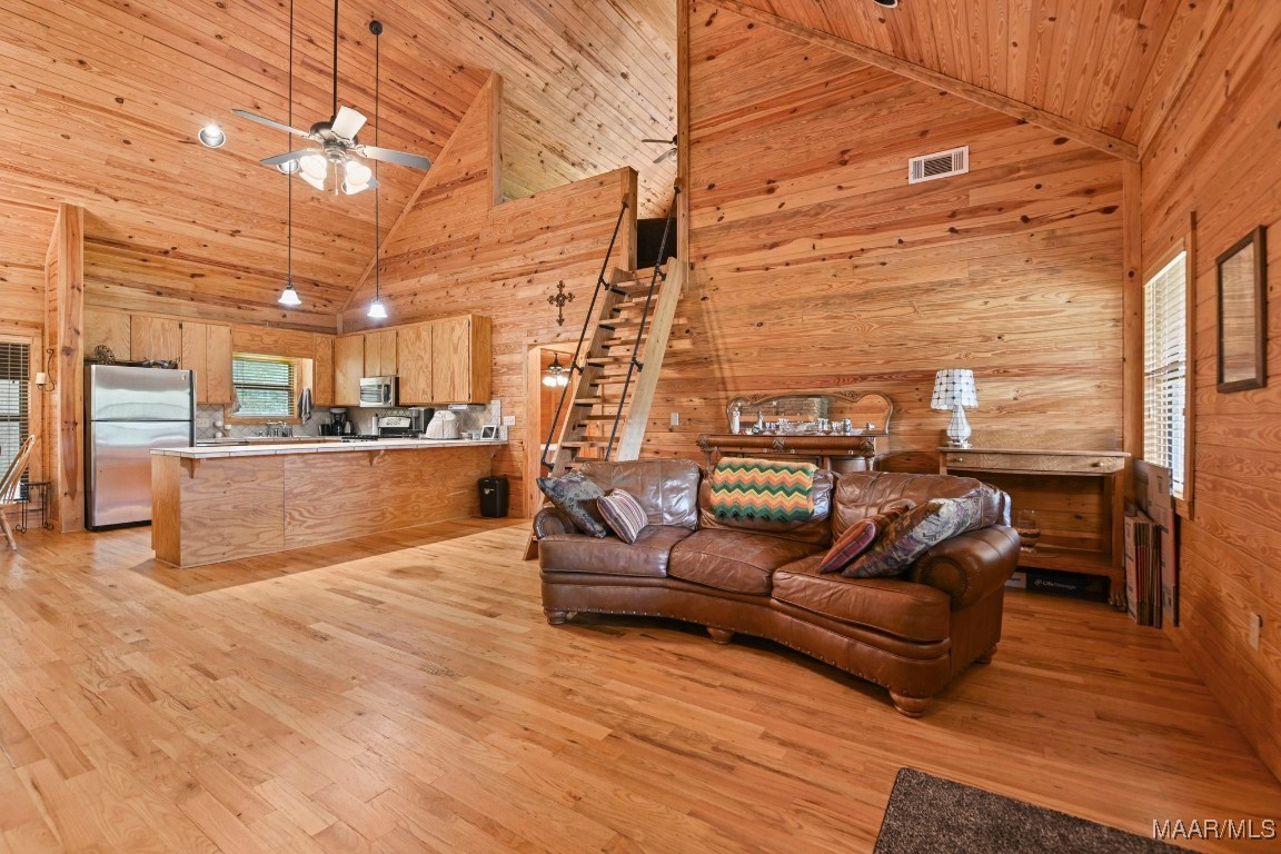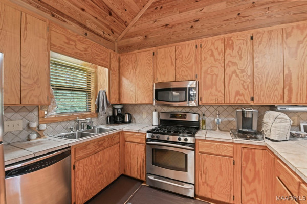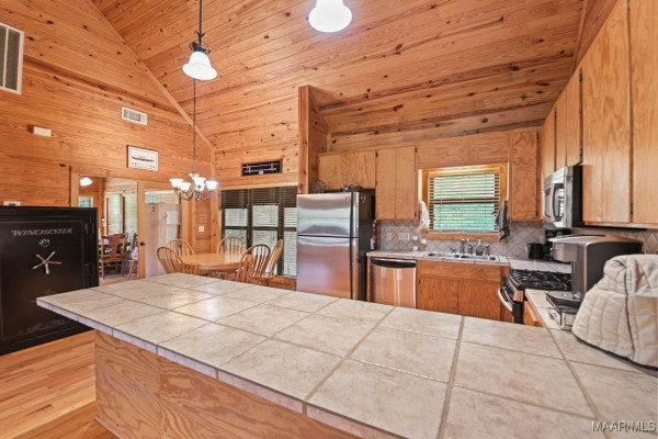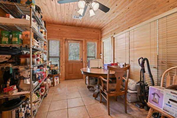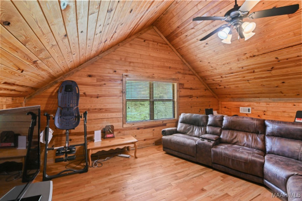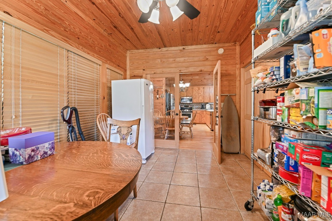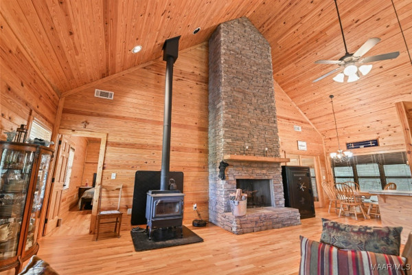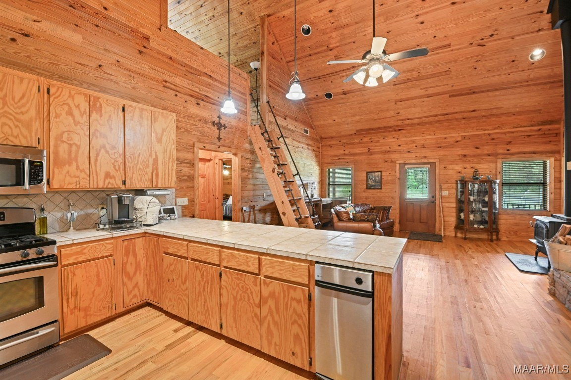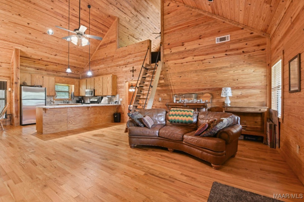 The home boasts real hardwood floors, a gas stovetop with electric oven, and tile countertops in the kitchen, along with a large laundry and pantry combo for convenience. Natural wood ceilings with exposed beams and plenty of windows fill the space with warmth and light.