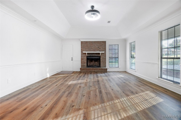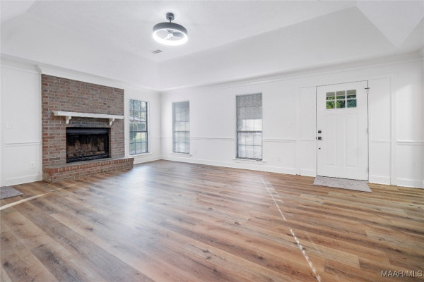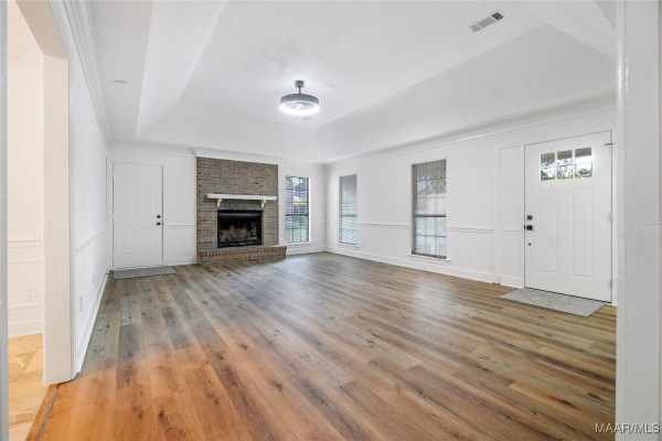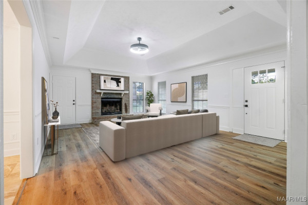 Step inside to a bright and airy living room featuring a stunning tray ceiling and cozy wood burning fireplace, perfect for relaxing or entertaining. The separate formal dining room with wainscoting and gorgeous chair rail sets the stage for memorable gatherings, while the newly renovated kitchen is a chef’s dream, boasting refaced cabinets, gleaming new stainless-steel appliances, and stylish granite countertops. Freshly painted walls and new flooring throughout create a crisp, contemporary feel.