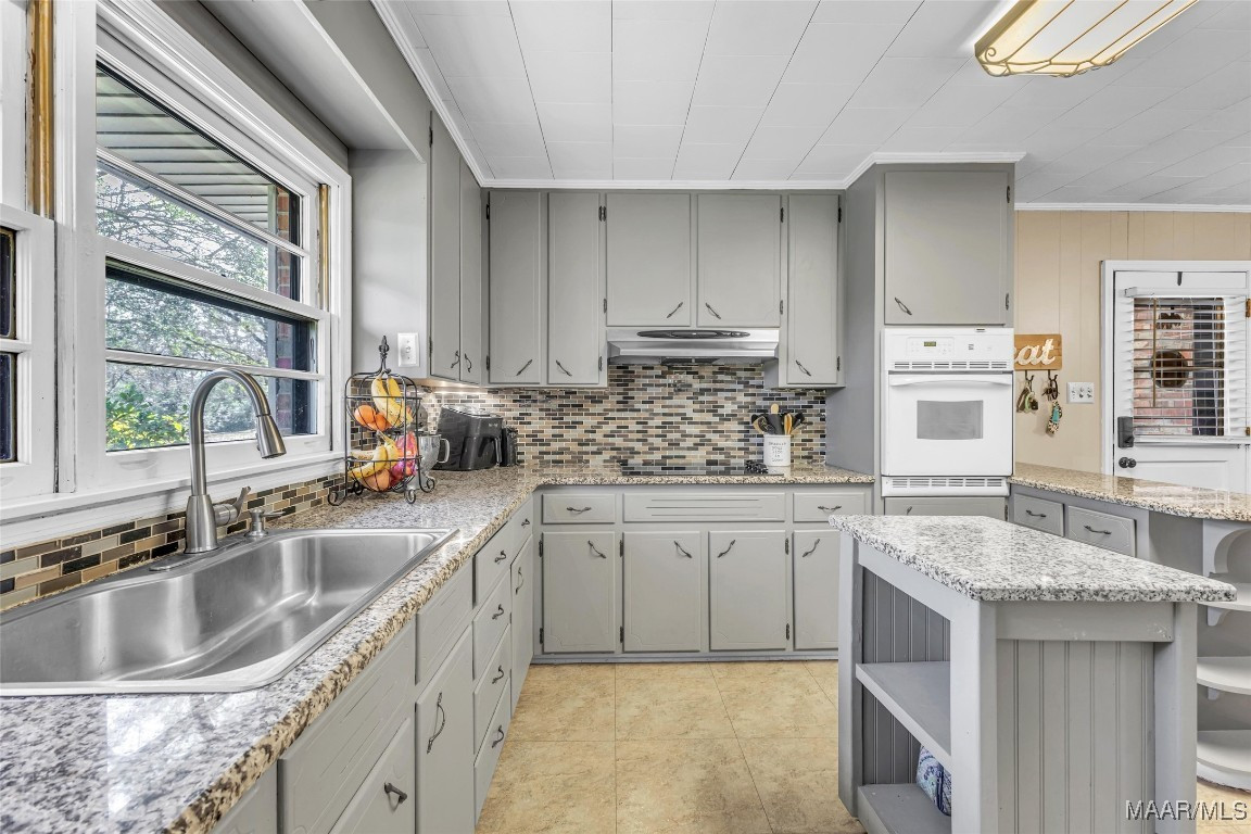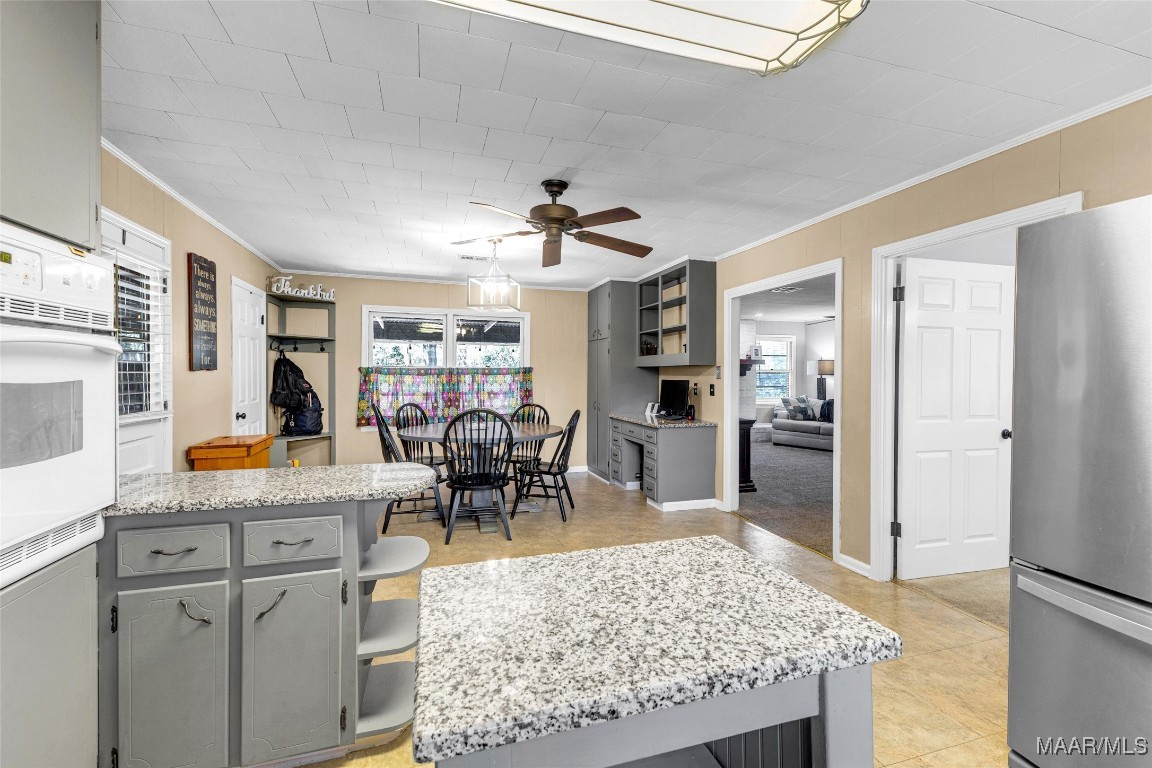 Situated on nearly an acre with a gated entrance, this 3-bedroom, 2-bath home welcomes you with original wood floors in the hallway and bedrooms, adding charm and authenticity throughout. Enter through the carport into the spacious eat-in kitchen, featuring updated granite countertops, a large sink, built-in desk area, and a convenient drop zone. Just off the kitchen is the laundry room, making daily living easy and functional.