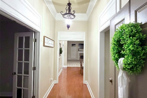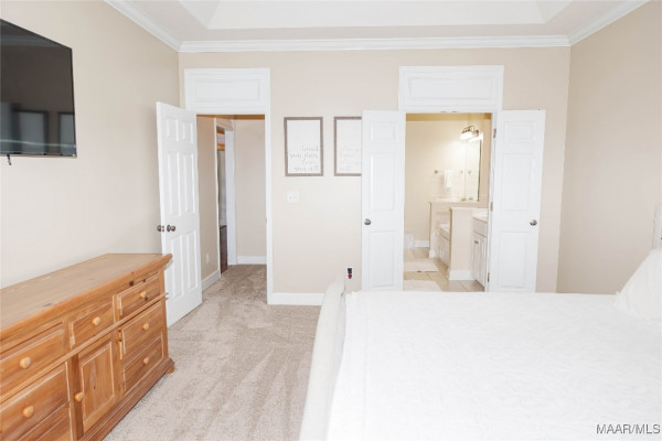 Step inside to a welcoming foyer with tall ceilings that open into a spacious and comfortable living and dining area. The living room features a cozy fireplace, 13-foot ceilings with elegant crown molding, and large windows that showcase stunning golf course views, filling the space with natural light.