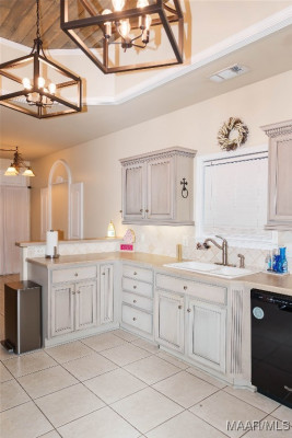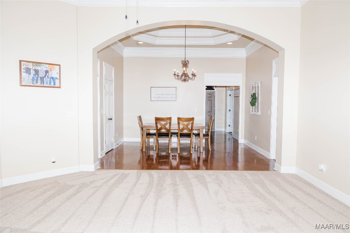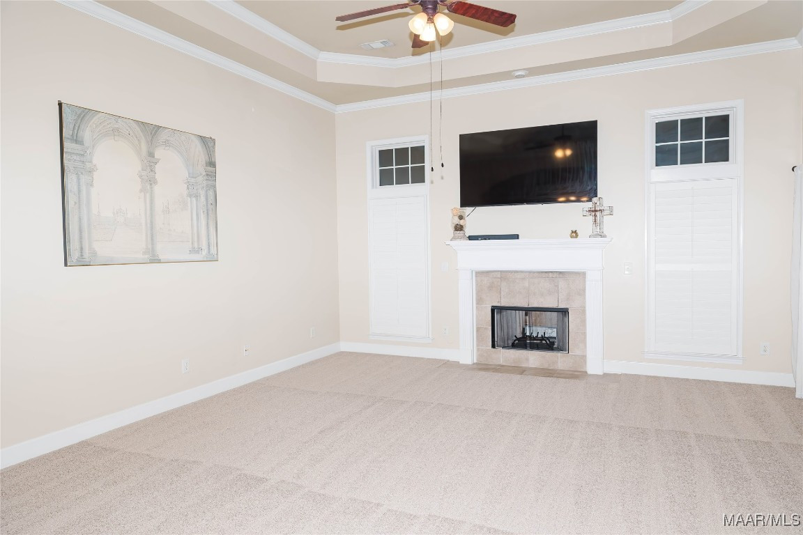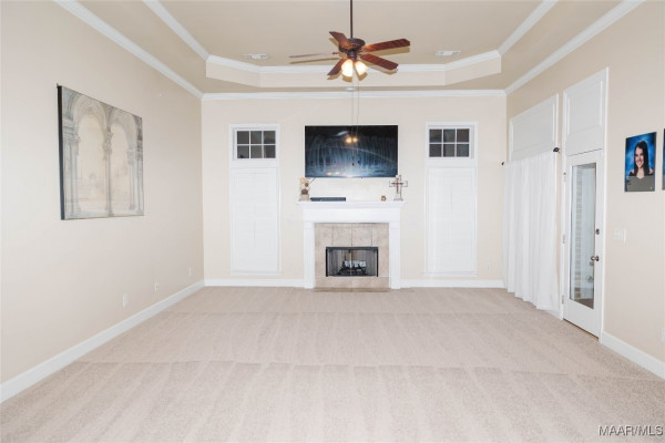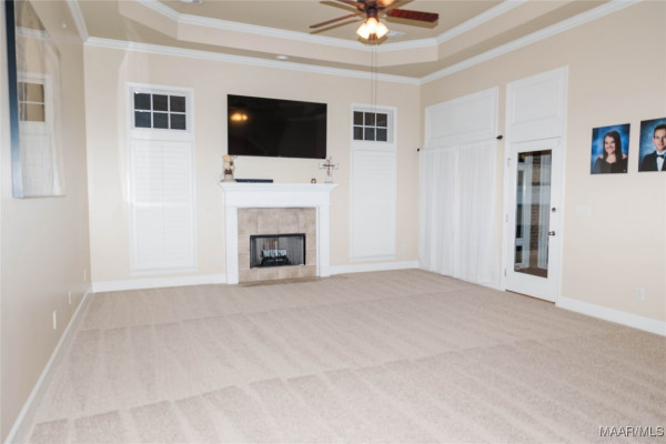 Step inside to a welcoming foyer with tall ceilings that open into a spacious and comfortable living and dining area. The living room features a cozy fireplace, 13-foot ceilings with elegant crown molding, and large windows that showcase stunning golf course views, filling the space with natural light.