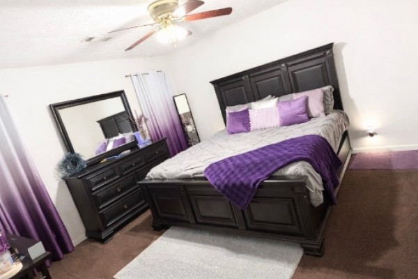 The primary suite is generously sized to comfortably fit a king-size bed and full furniture set. The ensuite bathroom offers separate vanities on opposite sides, oversized garden tub, two walk-in closets, and a private layout with the suite located on its own side of the home for added comfort and privacy.