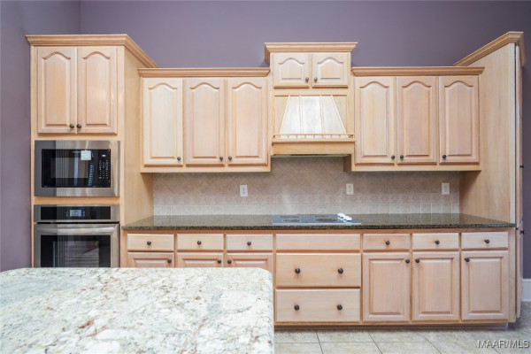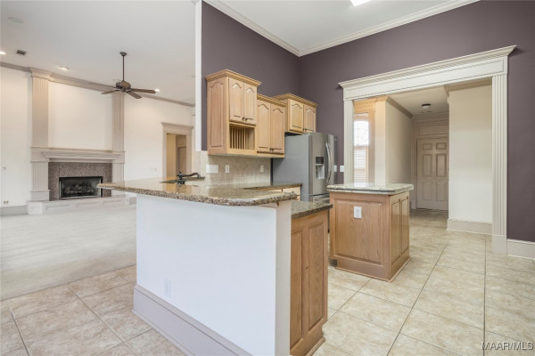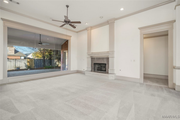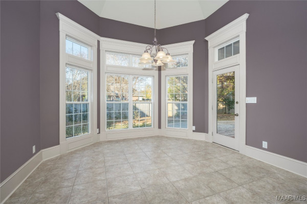 Inside, the front bedroom—with stained wood wainscoting, doors, and trim—makes an ideal home office or study. The study, primary suite, and breakfast area all showcase charming bay windows that bring in abundant natural light. The kitchen features custom cabinetry, a work island, and a breakfast bar overlooking the dining area with cathedral ceilings. The breakfast bar also opens partially to the large great room, highlighted by an impressive 8′ x 12″ glass window overlooking the covered patio.