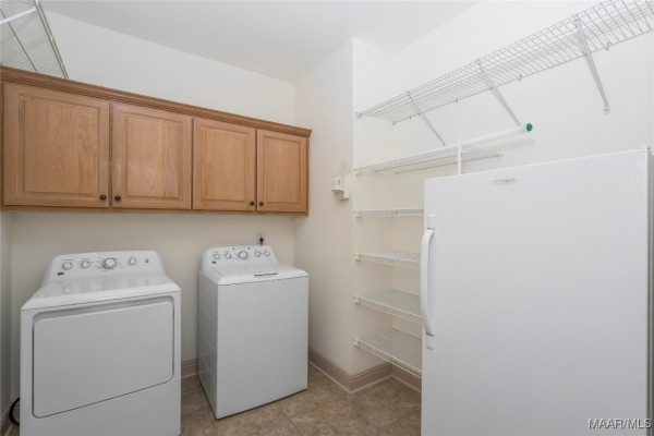 A roomy laundry room off the garage with space for a washer, dryer, and freezer