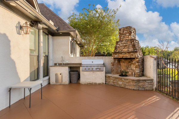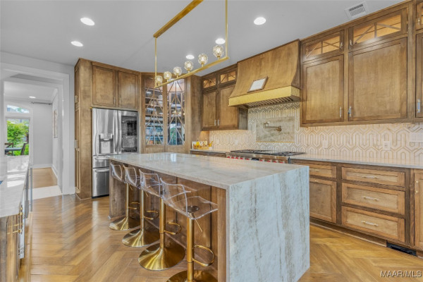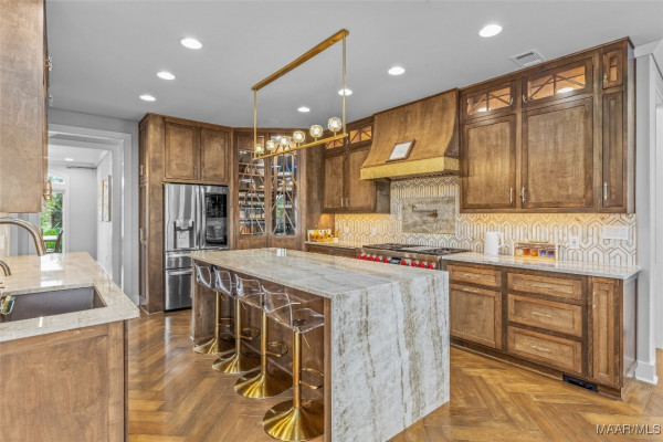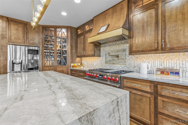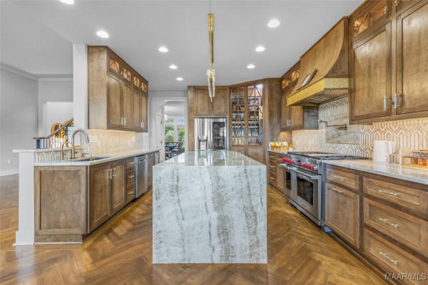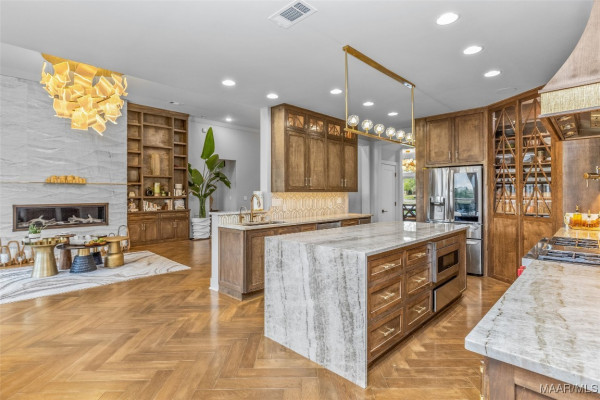 The open layout connects the gourmet kitchen, breakfast area, and family room with a striking stone fireplace. The kitchen features custom cabinets, Taj Mahal quartzite countertops, top-tier stainless appliances, a Wolf 8-burner stove, double ovens, commercial-grade hood, farmhouse sink, toe-kick vacuum system and extra storage under the cabinet, and fresh water taps at the kitchen and laundry sinks.
