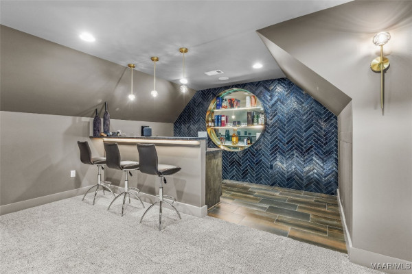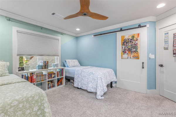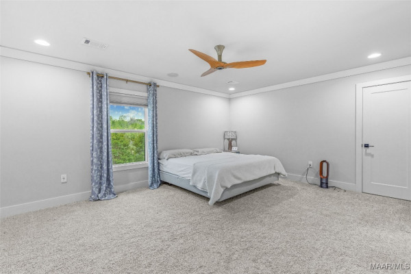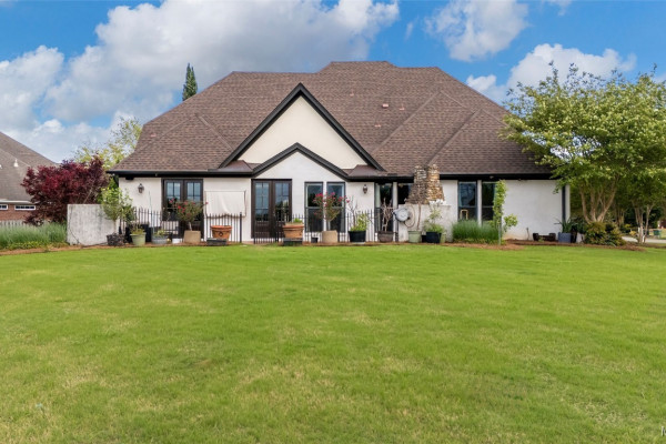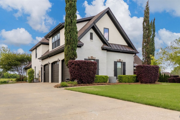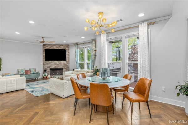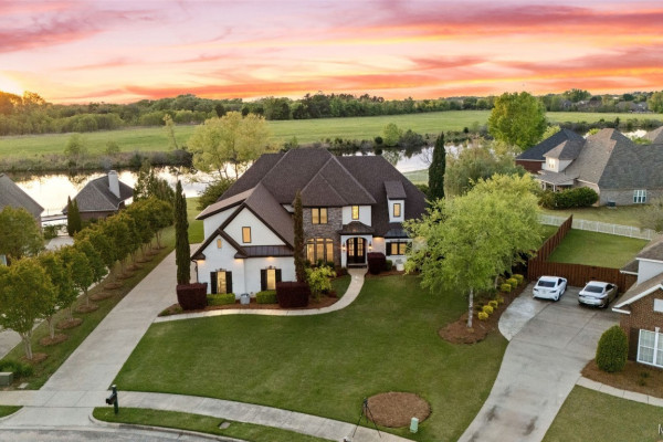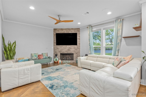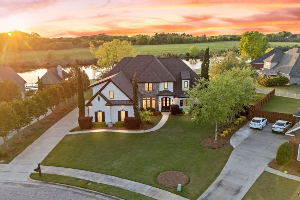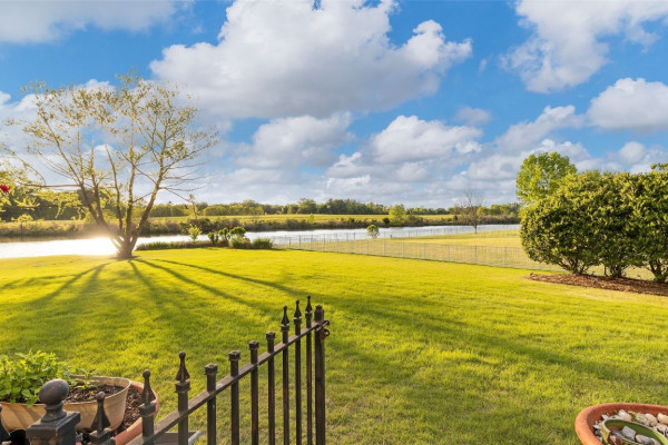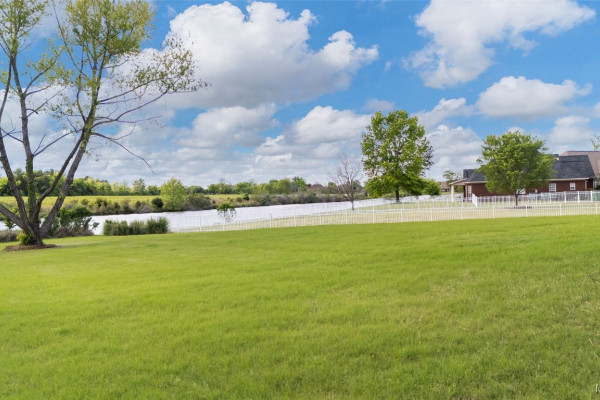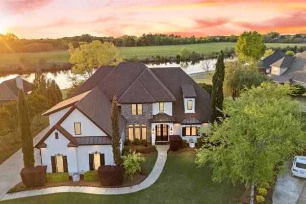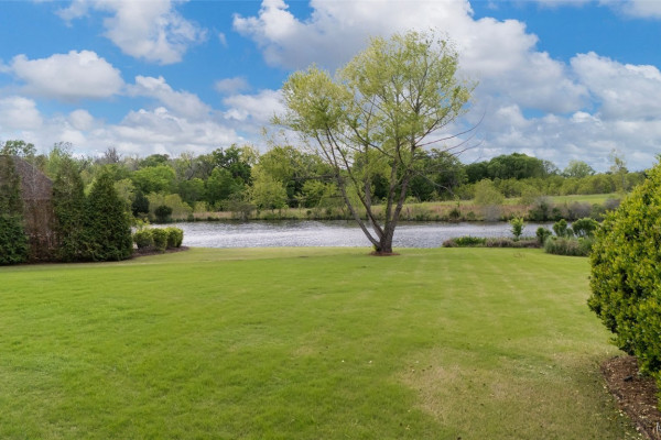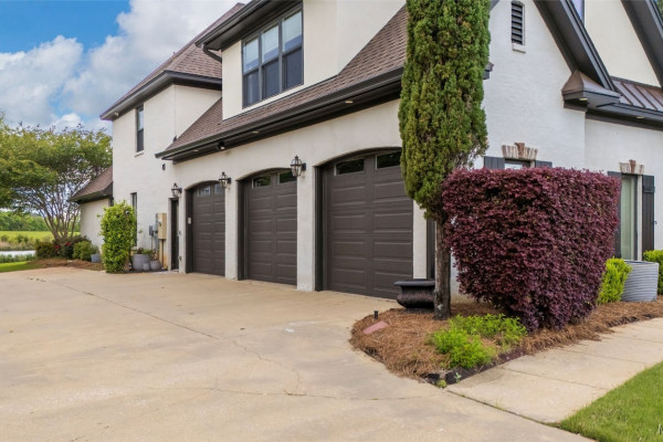Outdoor living includes 700 sq. ft. of patio space with a full kitchen, fireplace, and peaceful views of a stocked pond exclusive to waterfront homeowners. The 3-car garage is insulated with epoxy floors, built-in cabinetry, and one bay heated and cooled ideal for a workshop, gym, or hobby room.
