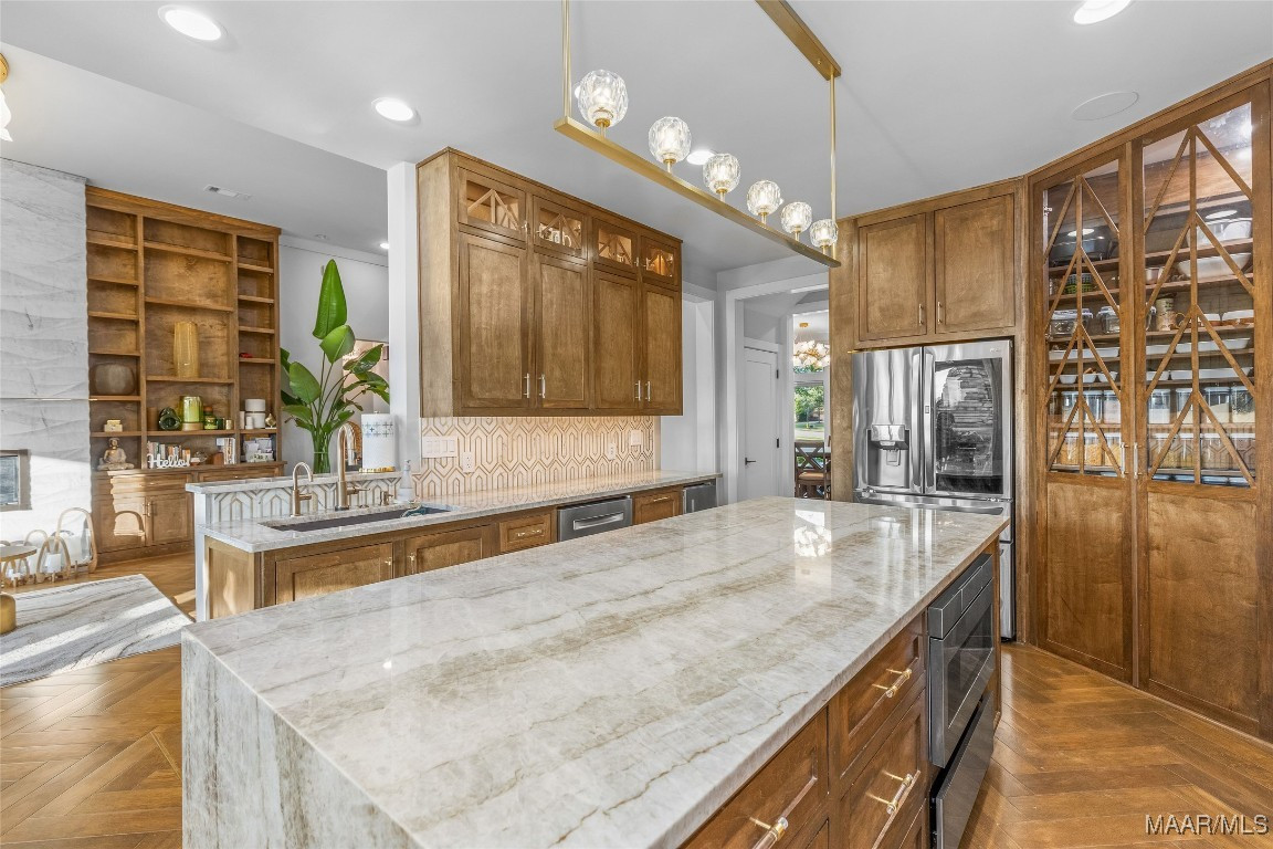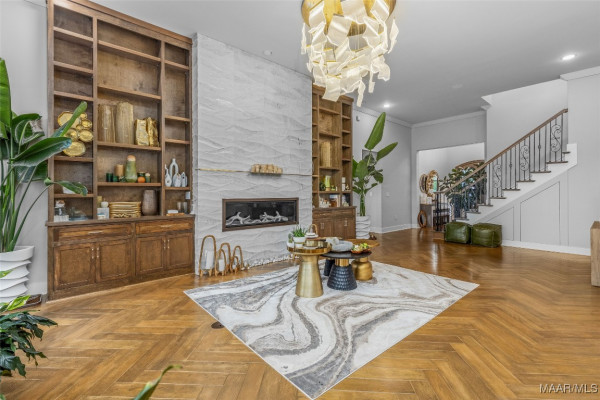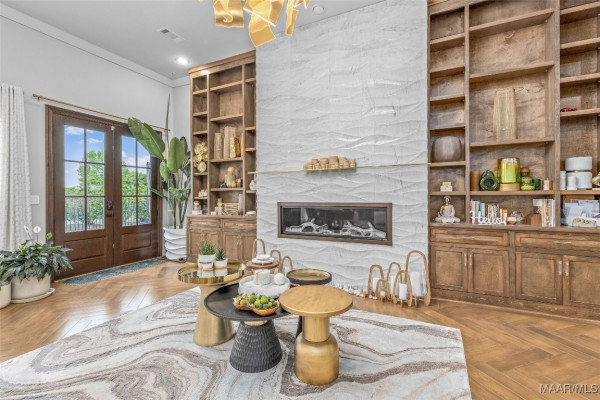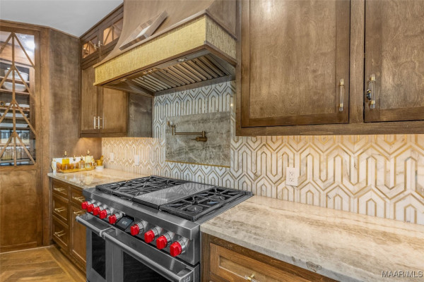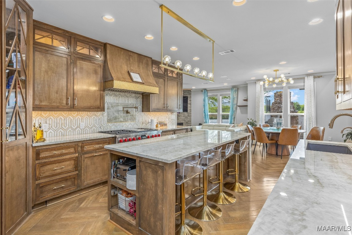 The open layout connects the gourmet kitchen, breakfast area, and family room with a striking stone fireplace. The kitchen features custom cabinets, Taj Mahal quartzite countertops, top-tier stainless appliances, a Wolf 8-burner stove, double ovens, commercial-grade hood, farmhouse sink, toe-kick vacuum system and extra storage under the cabinet, and fresh water taps at the kitchen and laundry sinks.