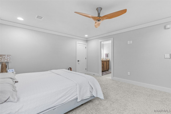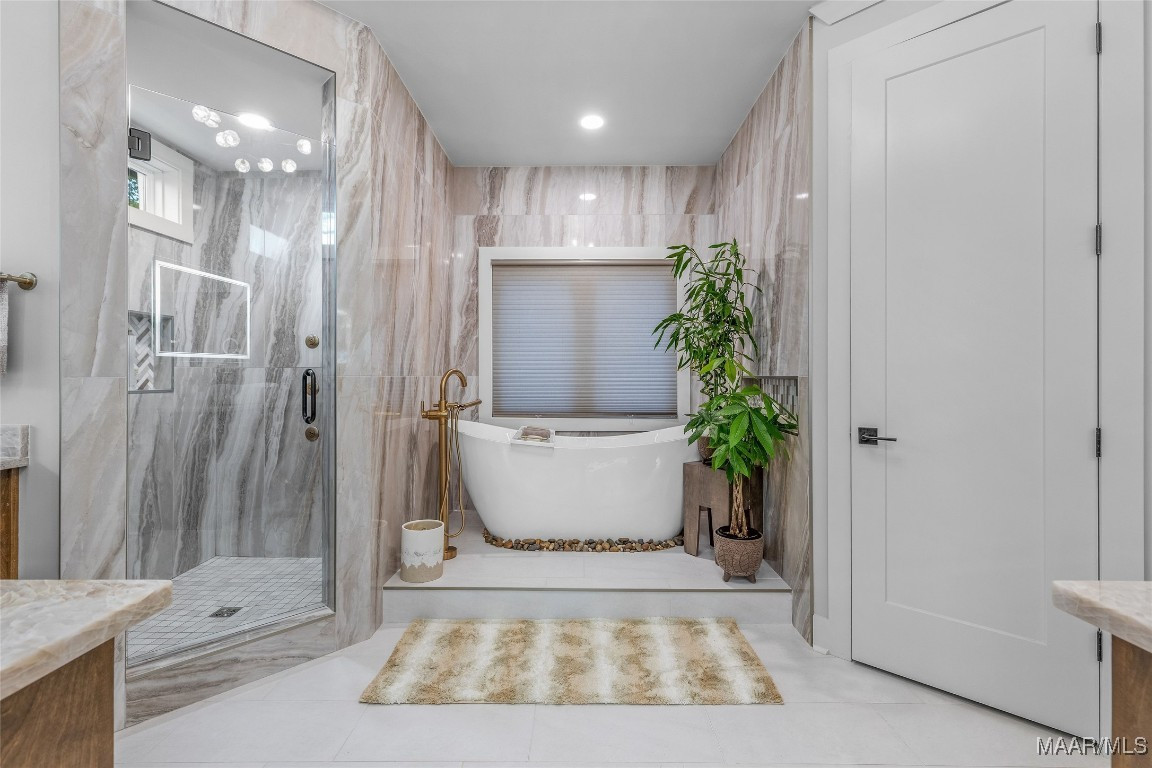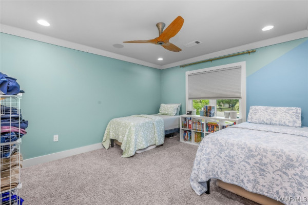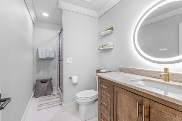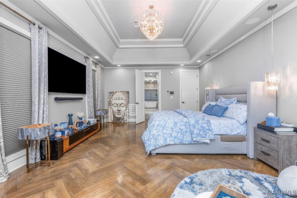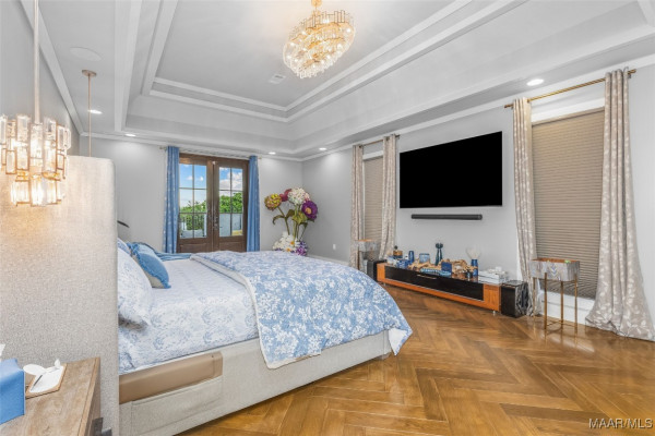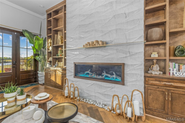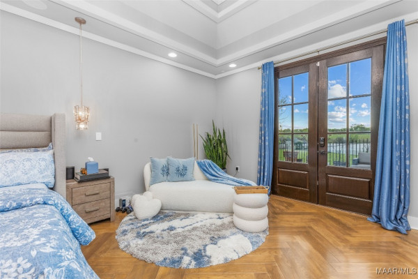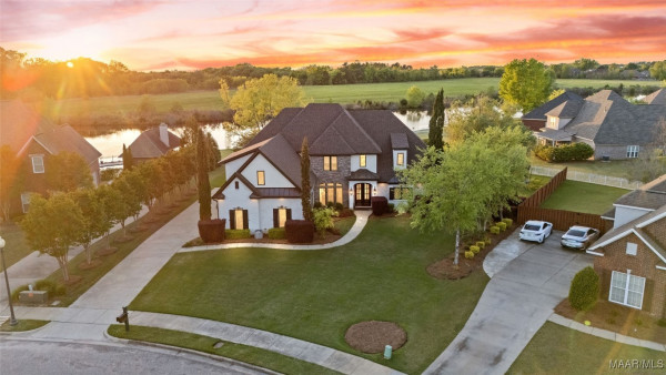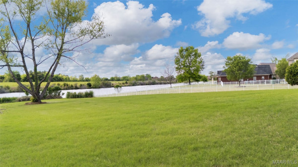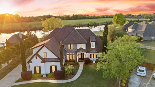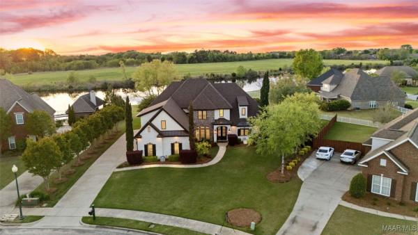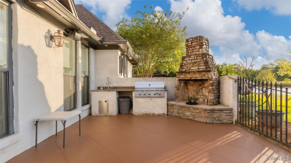 Outdoor living includes 700 sq. ft. of patio space with a full kitchen, fireplace, and peaceful views of a stocked pond exclusive to waterfront homeowners. The 3-car garage is insulated with epoxy floors, built-in cabinetry, and one bay heated and cooled ideal for a workshop, gym, or hobby room.
