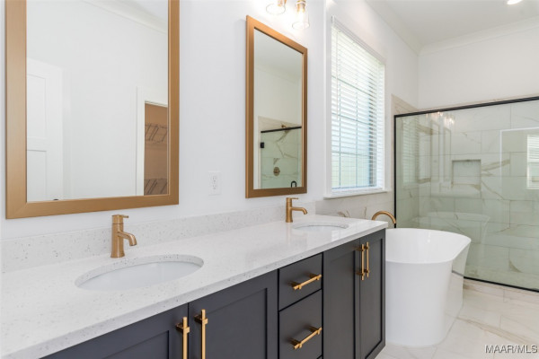 The Richmond I has 4 spacious bedrooms, 3 full baths, a study with a beautiful, coffered ceiling w/Glass pocket doors, a loft and a bonus room upstairs. As you enter the home you notice the 10-foot ceilings. Dining space is off the Kitchen. The Owners suite offers a large walk-in closet with a door that leads to the laundry/utility room and a stylish bath with a soaking tub and separate shower. Outdoor entertaining area features covered screened patio. Stunning front door. Dreamy kitchen fit for a Top Chef with a generous island and double stacked cabinets. A gas cooktop with a separate oven and a decorative hood vent, large Farmhouse sink, and pull-out trash can built in. A Morning Kitchen, Pantry, Wet bar with a sink and drink fridge are thoughtful features for a modern lifestyle. A laundry room that makes laundry fun and less of a chore with a mud hall entry way to drop all your personal belongings on the way in. You have the Owners suite plus an additional bedroom downstairs and 2 more bedrooms and bonus and loft area upstairs. Lowder New Homes offers a 10-year structural warranty from the industry’s leading home warranty company, 2-10 Home Warranty.