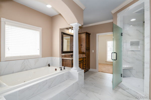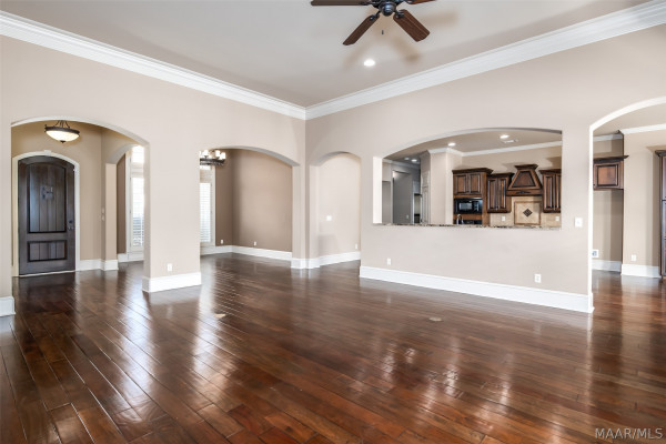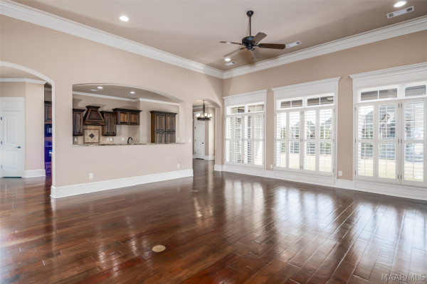 Stunning custom-built home in Rockbridge of Sturbridge. Let’s first talk about the recent improvements and updates! New architectural roof installed Nov 2025, two new HVAC units – 1 is 4 years old and other is 5 years old, tankless water heater installed in 2024 (in addition to an existing electric), totally refinished hardwood flooring throughout main living areas, master bath totally renovated with an oversized, luxurious shower! Now we can discuss the beauty, elegance and functionality of this incredible home. As you enter the towering arched front door (also recently totally refinished), you’ll step into a very classic foyer design with a handsome study to one side and a gorgeous formal dining on the other. The office features stained wood built-in bookcases and cabinet base plus a great storage closet. The dining room has massive 14′ high ceilings that add an elegant and very formal feel. Straight ahead from the foyer, you’ll enter the huge living room with its warm fireplace, double built-in bookshelves/bases and virtually wall to wall windows to flood the home with natural light. Beyond the living room, you’ll find the perfect chef’s kitchen with an enormous island for food prep, gas cook-top range, double pantries, tons of custom cabinetry and gorgeous, exotic granite countertops. The large, window filled breakfast room is the perfect place to enjoy your morning coffee. The master suite in this home is second to none and features a full glass door leading to the large, covered, back porch, nearly fully renovated bath with split vanities, huge shower with rain head and two separate walk-in closets. Two bedrooms that share a Jack-n-Jill bathroom round out the lower level. Upstairs is an enormous bonus room that could also be used as a bedroom and has a full bathroom. Out back you’ll find the perfect retreat under an expansive covered porch that overlooks a privacy fenced backyard. Storage galore in this home via a large storage/ hobby room alongside garage.