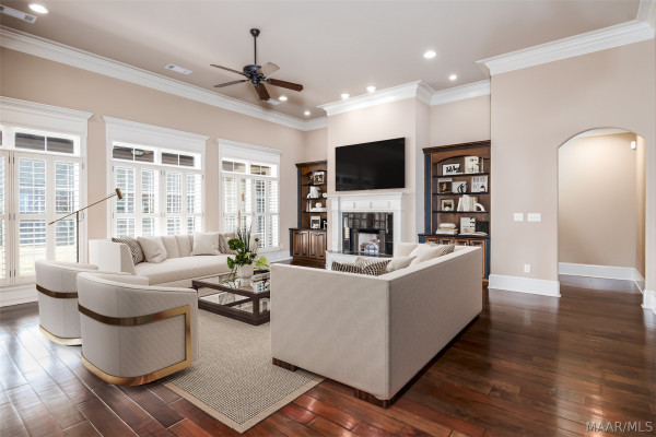 Stunning custom-built home in Rockbridge of Sturbridge. Let’s first talk about the recent improvements and updates! New architectural roof installed Nov 2025, two new HVAC units – 1 is 4 years old and other is 5 years old, tankless water heater installed in 2024 (in addition to an existing electric), totally refinished hardwood flooring throughout main living areas, master bath totally renovated with an oversized, luxurious shower! Now we can discuss the beauty, elegance and functionality of this incredible home. As you enter the towering arched front door (also recently totally refinished), you’ll step into a very classic foyer design with a handsome study to one side and a gorgeous formal dining on the other. The office features stained wood built-in bookcases and cabinet base plus a great storage closet. The dining room has massive 14′ high ceilings that add an elegant and very formal feel. Straight ahead from the foyer, you’ll enter the huge living room with its warm fireplace, double built-in bookshelves/bases and virtually wall to wall windows to flood the home with natural light. Beyond the living room, you’ll find the perfect chef’s kitchen with an enormous island for food prep, gas cook-top range, double pantries, tons of custom cabinetry and gorgeous, exotic granite countertops. The large, window filled breakfast room is the perfect place to enjoy your morning coffee. The master suite in this home is second to none and features a full glass door leading to the large, covered, back porch, nearly fully renovated bath with split vanities, huge shower with rain head and two separate walk-in closets. Two bedrooms that share a Jack-n-Jill bathroom round out the lower level. Upstairs is an enormous bonus room that could also be used as a bedroom and has a full bathroom. Out back you’ll find the perfect retreat under an expansive covered porch that overlooks a privacy fenced backyard. Storage galore in this home via a large storage/ hobby room alongside garage.