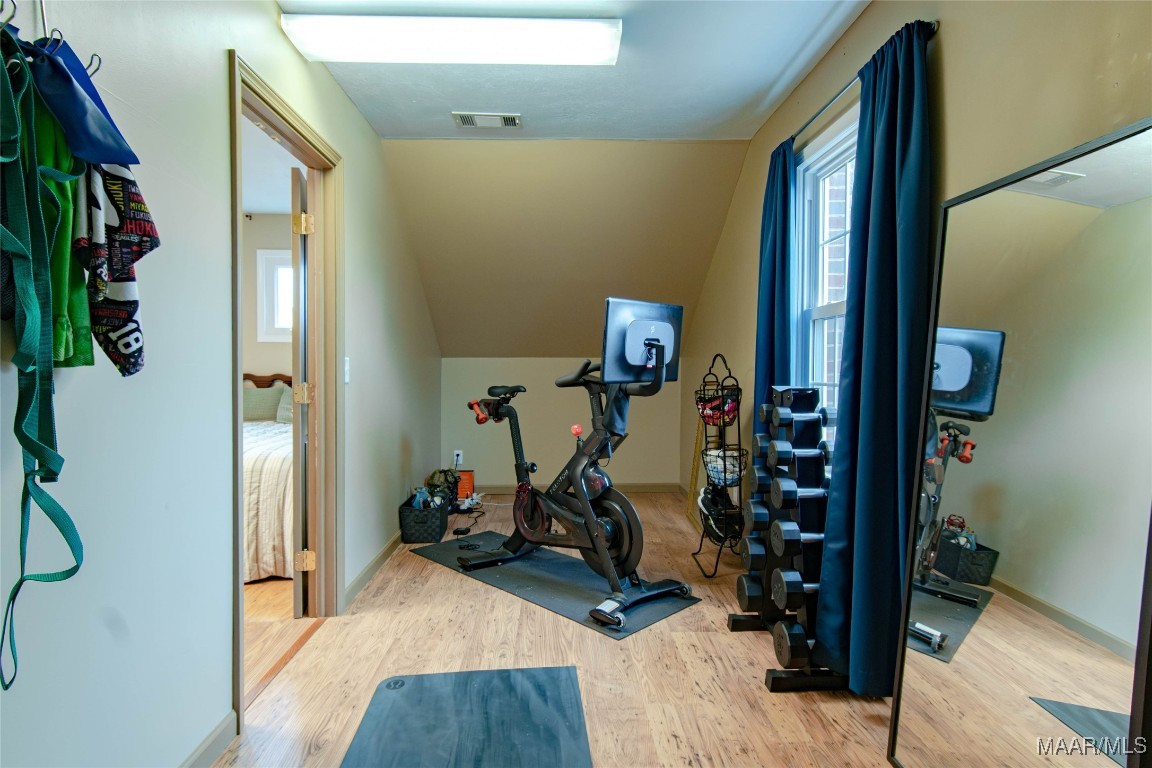 The split floor plan features the primary suite plus three additional bedrooms and two full baths on the main level, with an upstairs fifth bedroom/bonus room complete with a full bath and an oversized walk-in closet currently used as an exercise room.