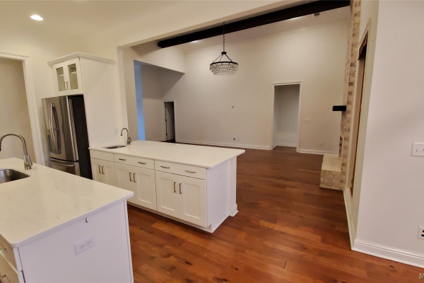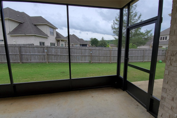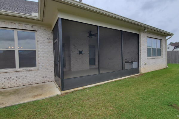 The spacious living area flows seamlessly into the well-appointed kitchen, which features a large island workspace, custom vent hood, granite countertops, solid wood cabinetry with soft-close drawers, and a generous walk-in pantry. A bright breakfast room with double doors opens to an expansive covered, screened-in back porch—perfect for relaxing or entertaining guests.