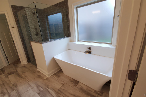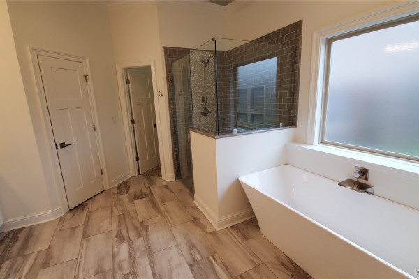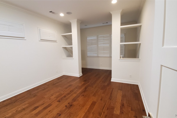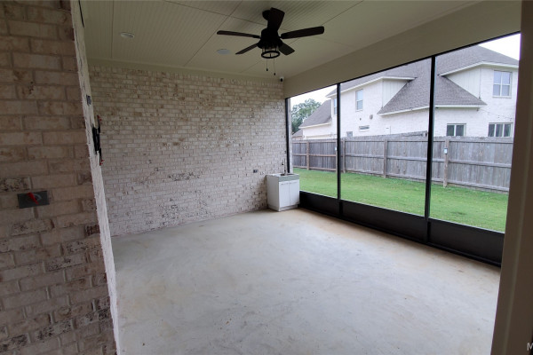 Quality construction and energy-efficient features include spray foam insulation, Low-E windows, a tankless gas water heater, and a gas log fireplace with electric switch igniter. Hardwood flooring extends through all common areas, while tile finishes are featured in bathrooms, showers, and the laundry room. The home is also pre-wired for a security system and surround sound.