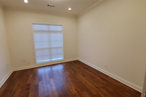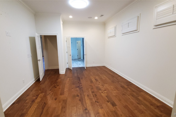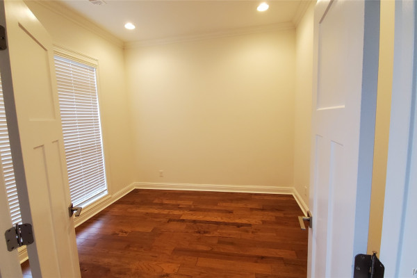 The elegant primary suite offers a private sitting area and a luxurious en-suite bath complete with a freestanding soaking tub, large frameless glass shower, double vanities, and an oversized walk-in closet. Additional living spaces include a dining room with built-in pocket doors that can easily serve as a flex space, a dedicated study or home office with double doors, a convenient half bath for guests, and a guest bedroom with access to a private bath.